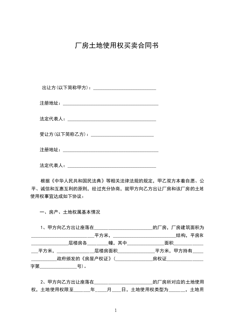 根据《中华人民共和国民法典》等相关法律法规的规定,甲乙双方本着自愿、公平、诚信和互惠互利的原则,经过充分协商,就甲方向乙方出让厂房和该厂房的土地使用权事宜达成如下协议: