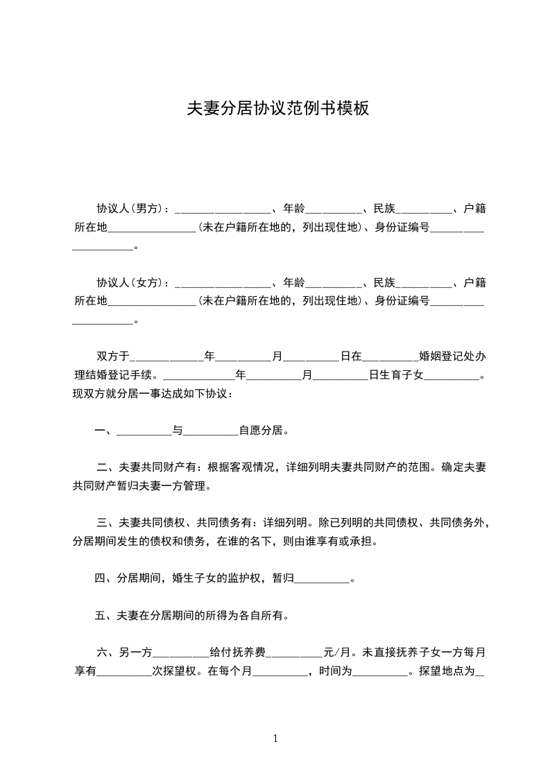 3、分居期间,___方每周探望___一次,时间为24小时,定为每周星期六早上___时到星期天早上___时,由___方到___方居住地接送。