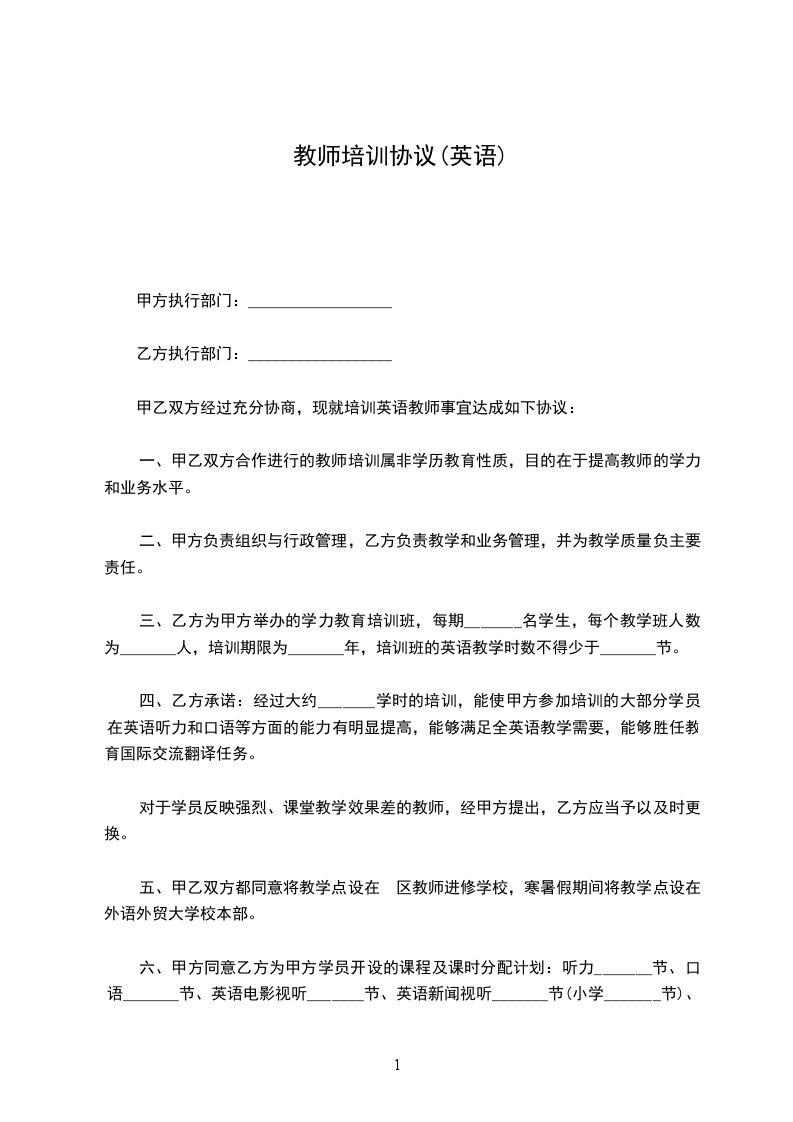 甲乙双方经过充分协商,现就培训英语教师事宜达成如下协议: