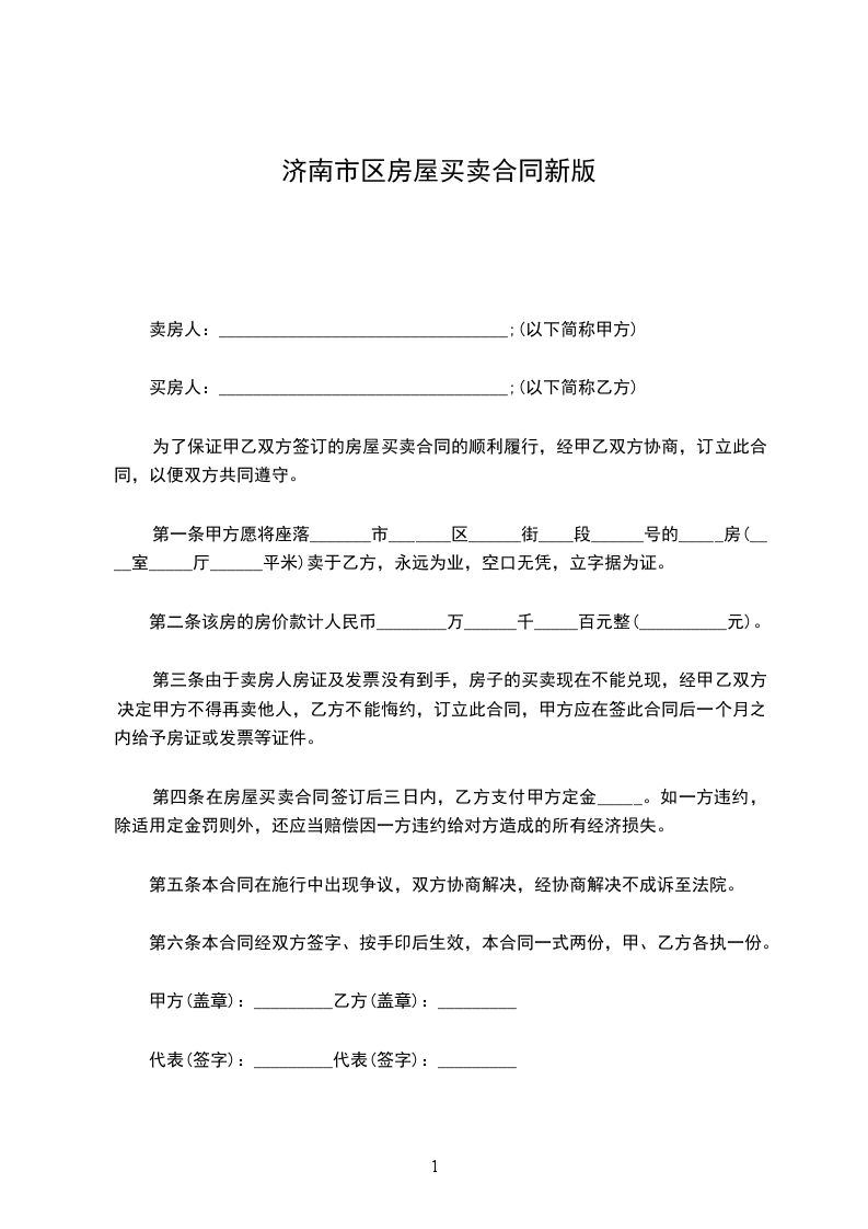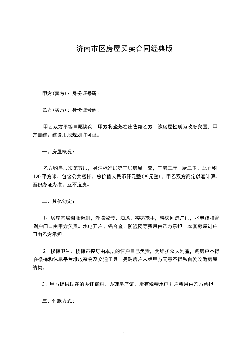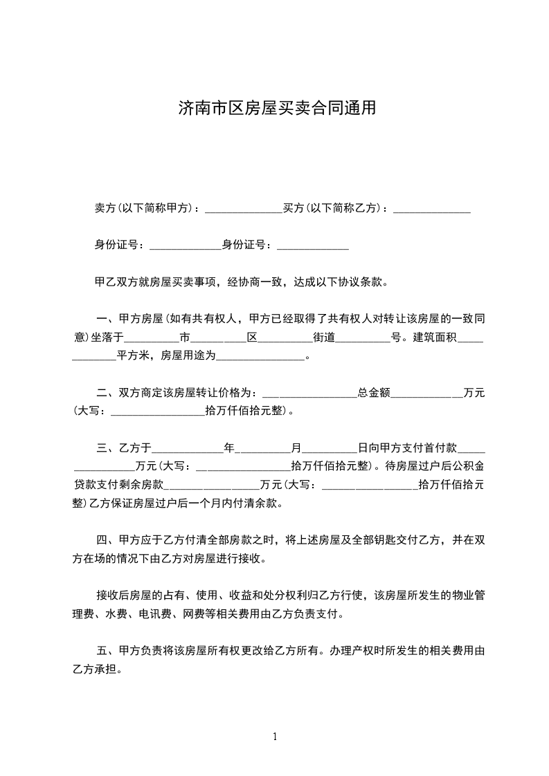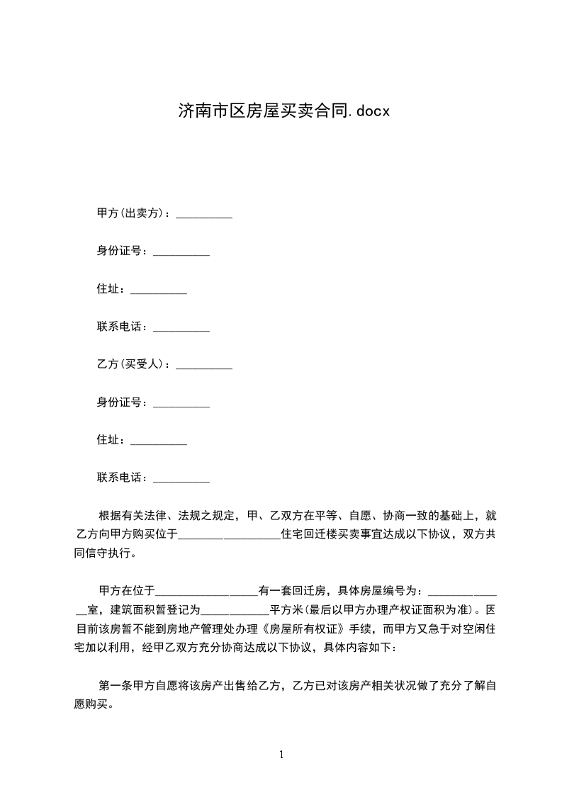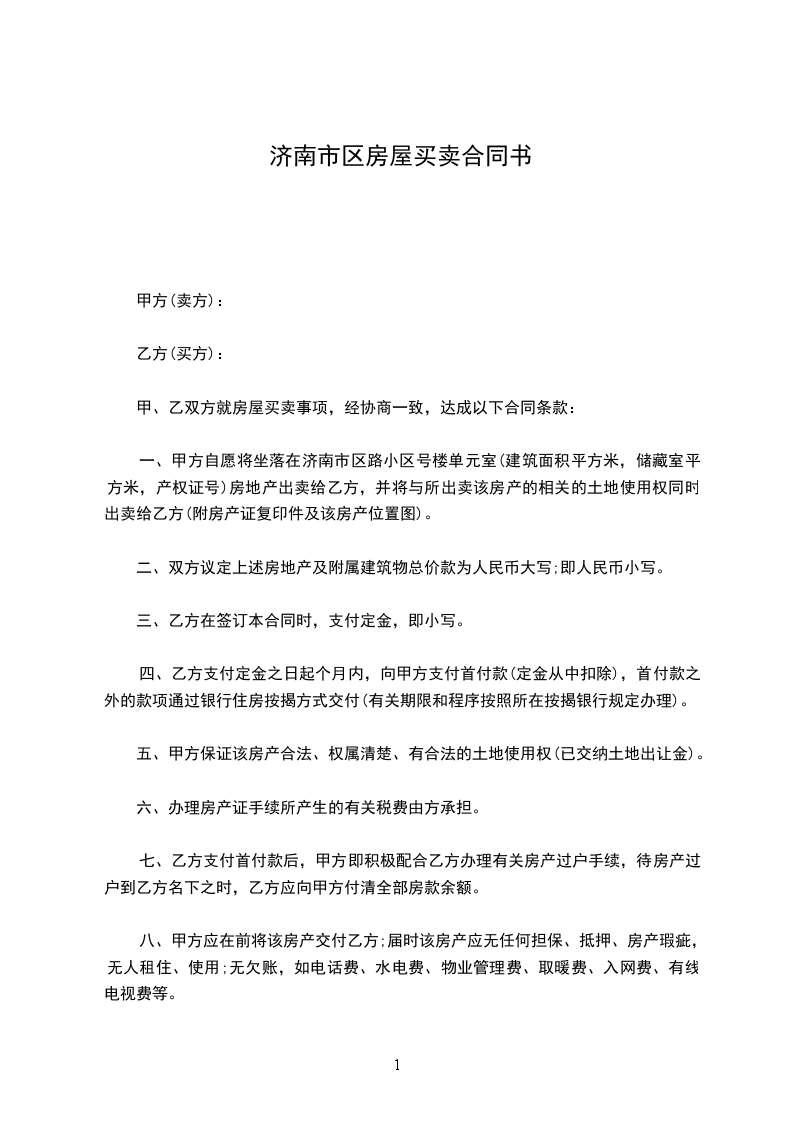 一、甲方自愿将坐落在济南市区路小区号楼单元室(建筑面积平方米,储藏室平方米,产权证号)房地产出卖给乙方,并将与所出卖该房产的相关的土地使用权同时出卖给乙方(附房产证复印件及该房产位置图)。