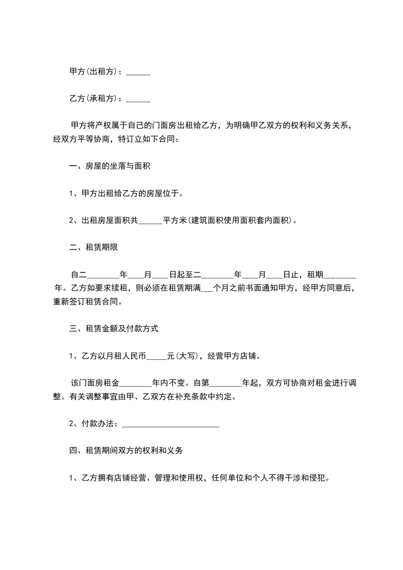 1、乙方以月租人民币_____元(大写),经营甲方店铺。