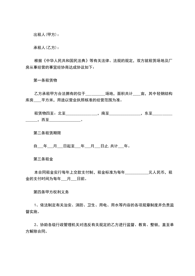 根据《中华人民共和国民法典》等有关法律、法规的规定,双方就租赁场地及厂房从事经营的事宜经协商达成协议如下: