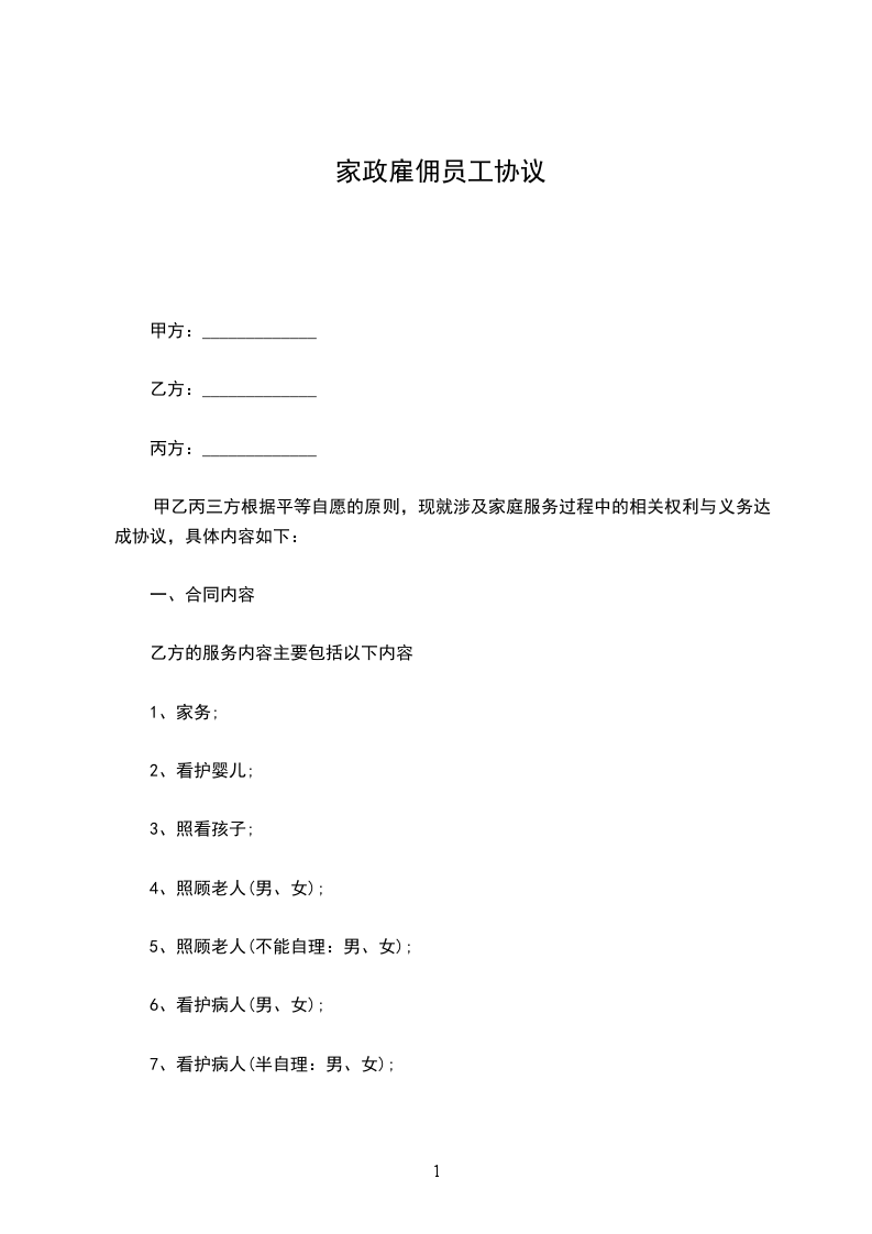 甲乙丙三方根据平等自愿的原则,现就涉及家庭服务过程中的相关权利与义务达成协议,具体内容如下: