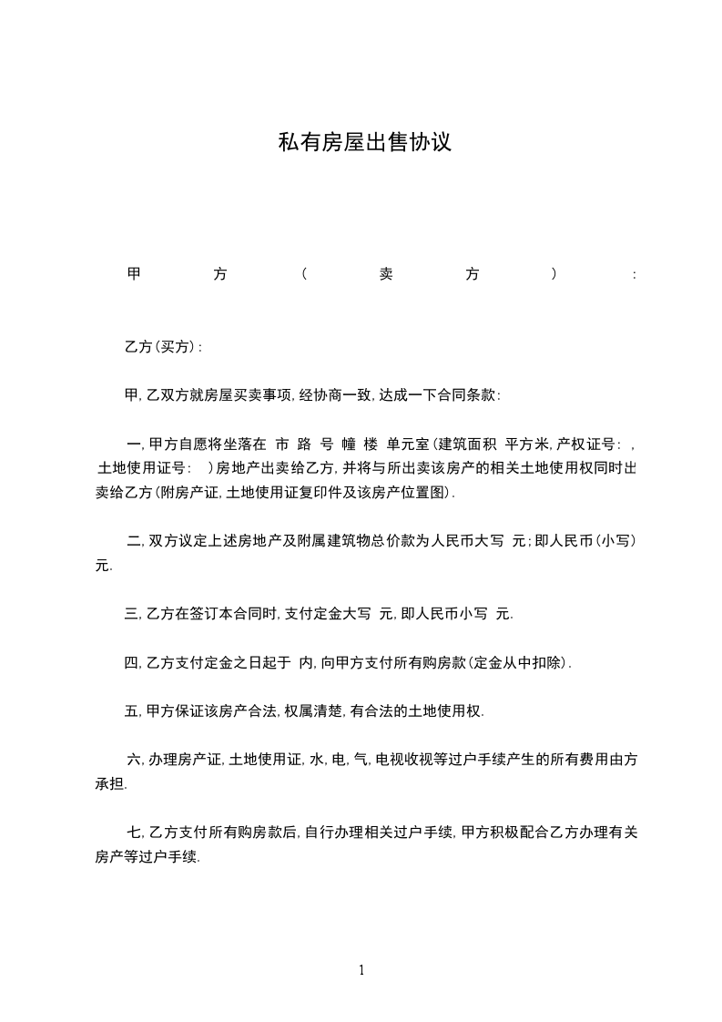 一,甲方自愿将坐落在 市 路 号 幢 楼 单元室(建筑面积 平方米,产权证号: ,土地使用证号: )房地产出卖给乙方,并将与所出卖该房产的相关土地使用权同时出卖给乙方(附房产证,土地使用证复印件及该房产位置图).