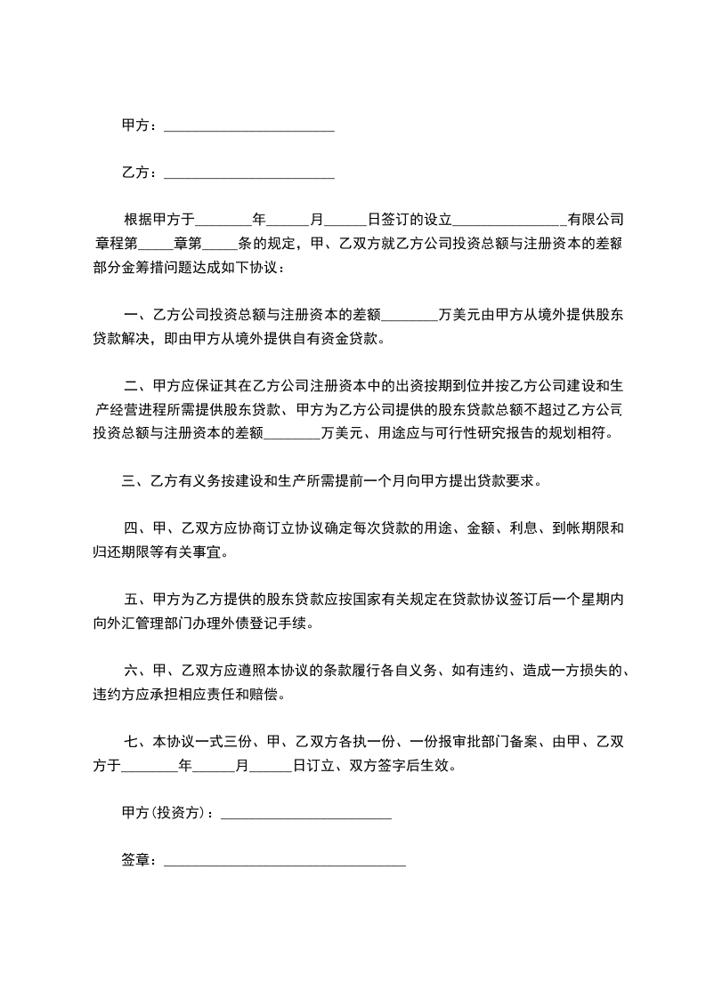 一、乙方公司投资总额与注册资本的差额________万美元由甲方从境外提供股东贷款解决,即由甲方从境外提供自有资金贷款。