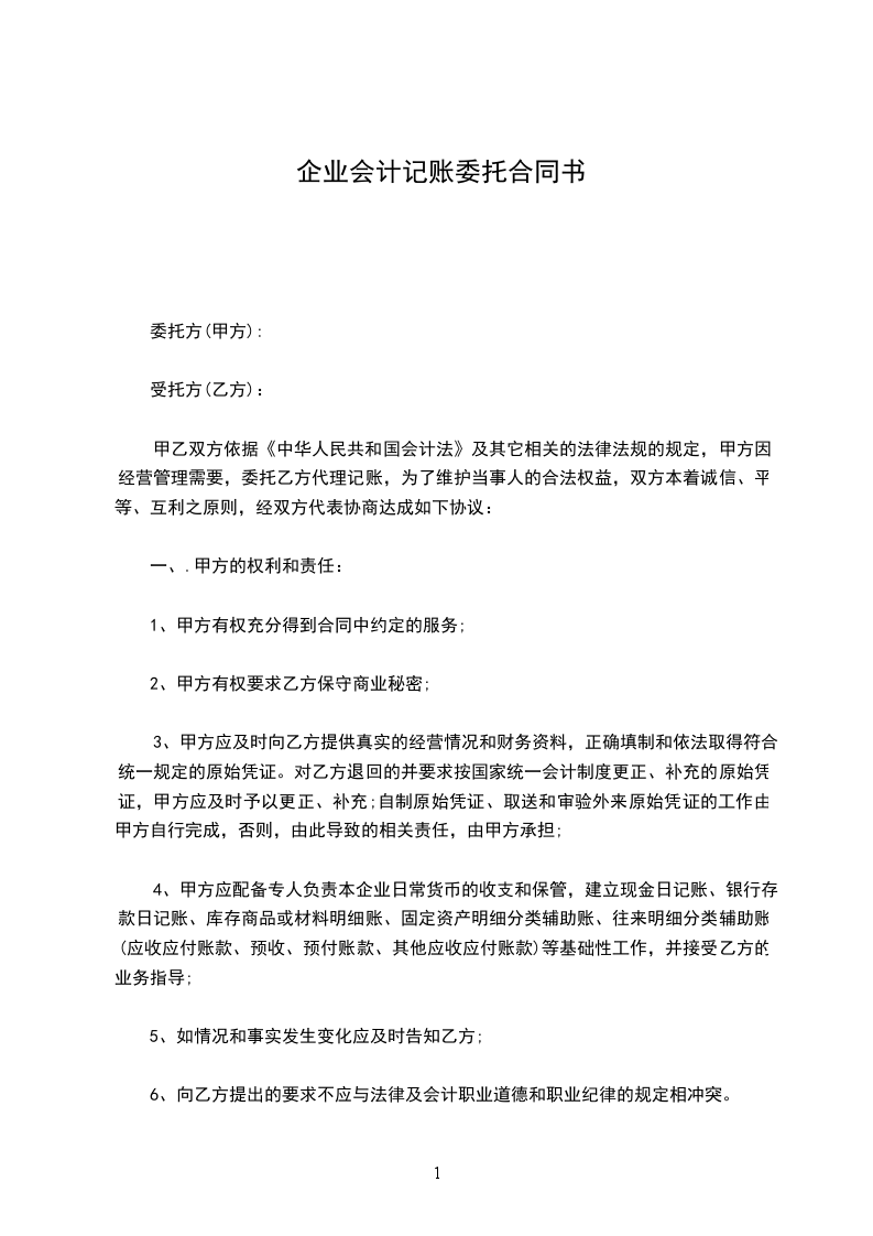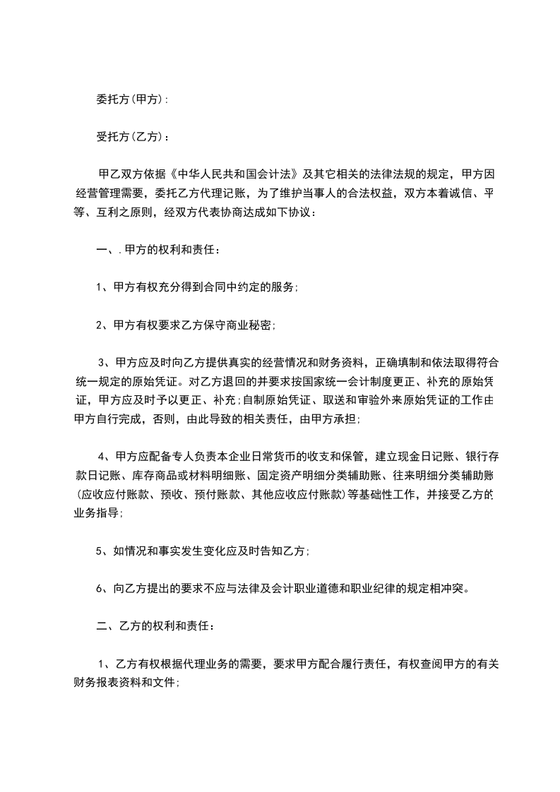 甲乙双方依据《中华人民共和国会计法》及其它相关的法律法规的规定,甲方因经营管理需要,委托乙方代理记账,为了维护当事人的合法权益,双方本着诚信、平等、互利之原则,经双方代表协商达成如下协议: