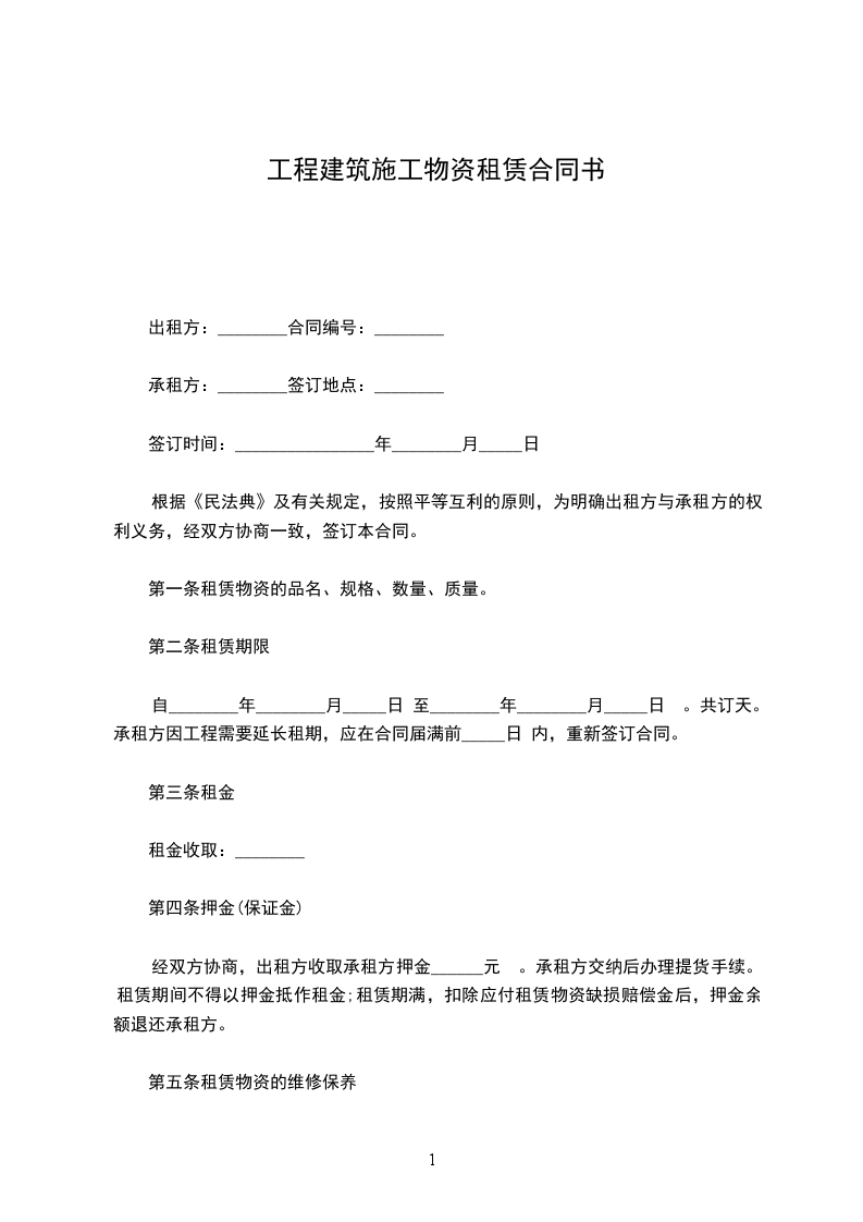 出租方:合同编号:承租方:签订地点:签订时间:_____年_____月_____日根据《民法典》及有关规定,按照平等互利的原则,为明确出租方与承租方的权利义务,经双方协商一致,签订本合同。