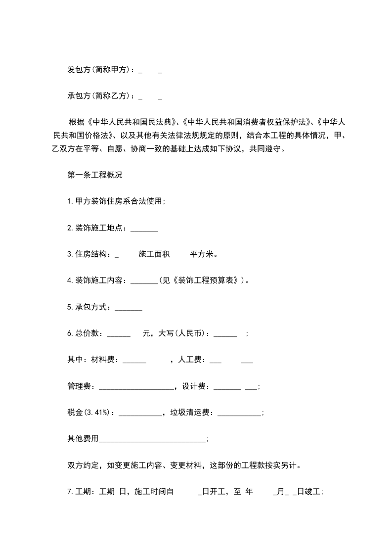 根据《中华人民共和国民法典》、《建筑安装工程承包合同条例》、《中华人民共和国消费者权益保_》、《中华人民共和国价格法》、《______市保护消费者合法权益条例》以及其他有关法律法规规定的原则,为保护双方的合法权益,结合本工程的具体情况,双方达成如下协议,共同遵守。