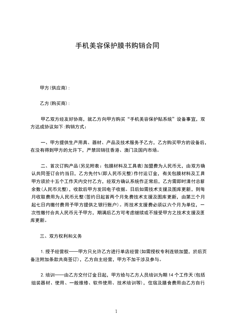 甲乙双方经友好协商,就乙方向甲方购买“手机美容保护贴系统”设备事宜,双方达成协议如下:购销方式: