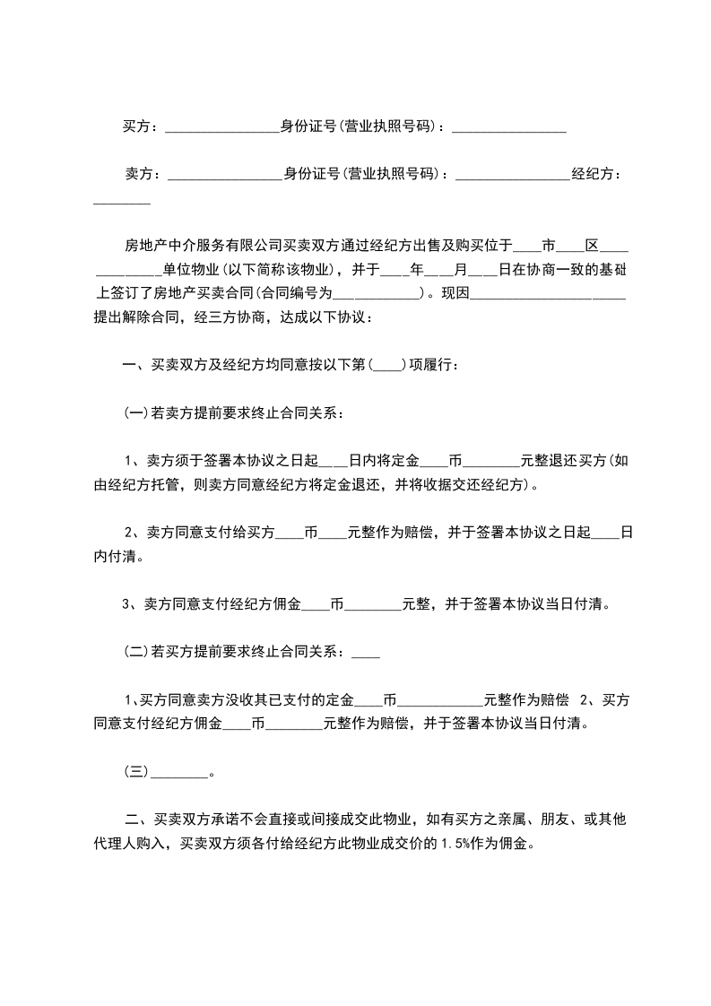 房地产中介服务有限公司买卖双方通过经纪方出售及购买位于____市____区_____________单位物业(以下简称该物业),并于____年____月____日在协商一致的基础上签订了房地产买卖合同(合同编号为____________)。现因______________________提出解除合同,经三方协商,达成以下协议: