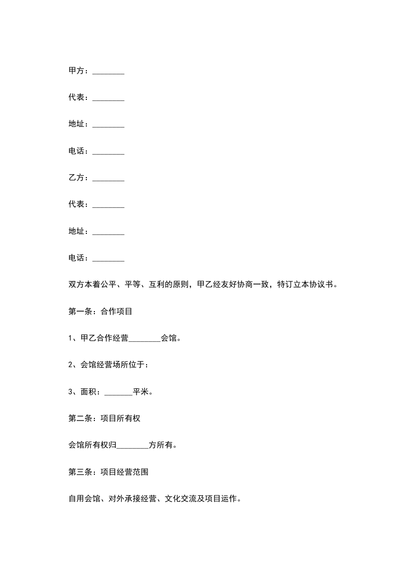 1、双方本着互惠互利、共同发展的目标共同经营会馆业务,甲方提供会馆经营的流动资金与场地,乙方负责会馆的日常运营。