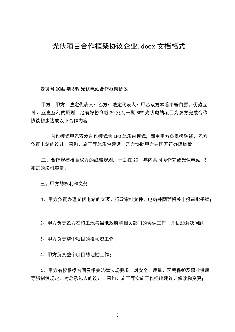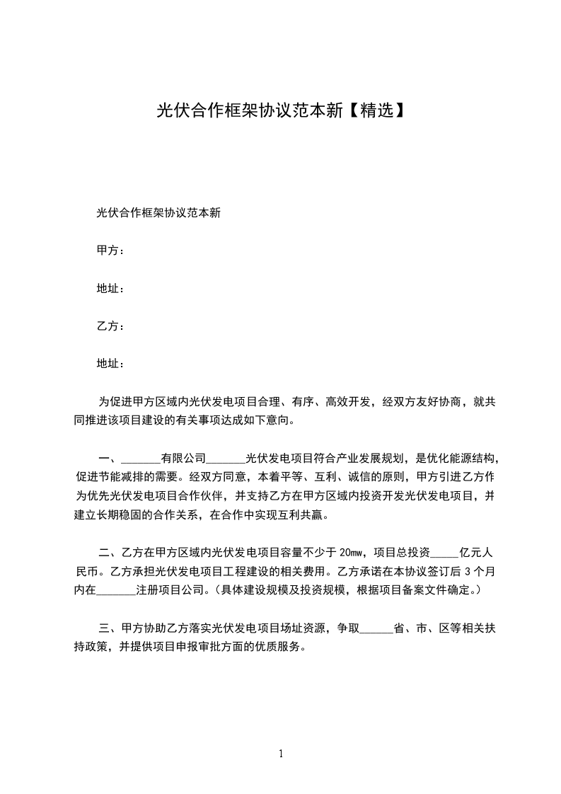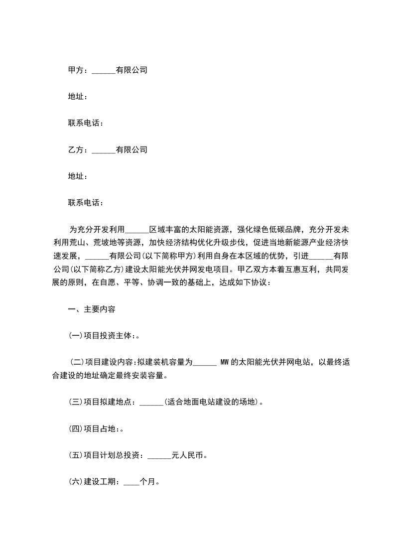 为充分开发利用______区域丰富的太阳能资源,强化绿色低碳品牌,充分开发未利用荒山、荒坡地等资源,加快经济结构优化升级步伐,促进当地新能源产业经济快速发展,______有限公司(以下简称甲方)利用自身在本区域的优势,引进______有限公司(以下简称乙方)建设太阳能光伏并网发电项目。甲乙双方本着互惠互利,共同发展的原则,在自愿、平等、协调一致的基础上,达成如下协议:
