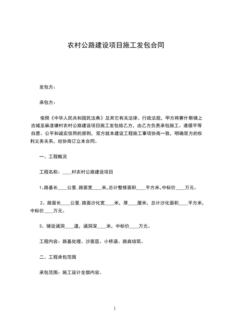 依照《中华人民共和国民法典》及其它有关法律、行政法规,甲方将赛什斯镇上古城至麻渣塘村农村公路建设项目施工发包给乙方,由乙方负责承包施工。遵循平等、自愿、公平和诚实信用的原则,双方就本建设工程施工事项协商一致,明确双方的权利义务关系,经协商订立本合同。