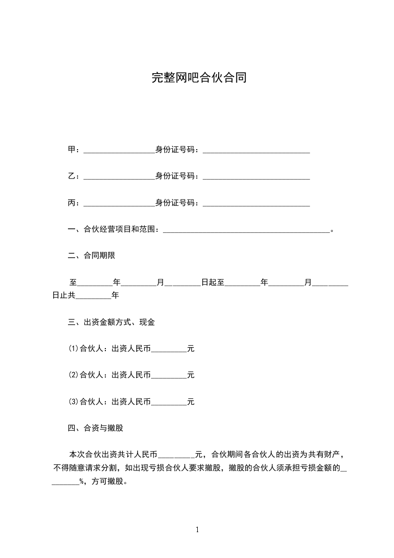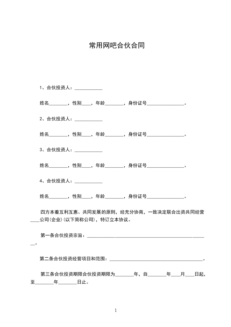甲、乙双方经充分协商,在平等自愿的基础上就合伙出资运营______网吧事宜达成如下协议: