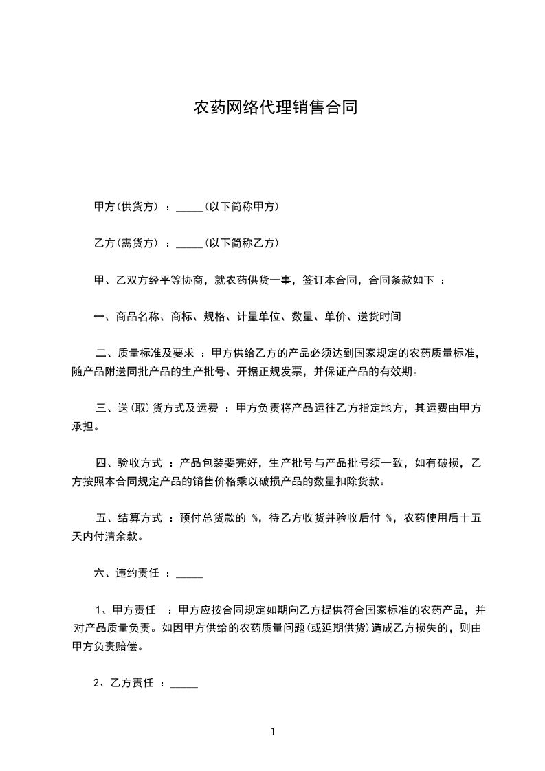 1、甲方责任:甲方应按合同规定如期向乙方提供符合国家标准的农药产品,并对产品质量负责。如因甲方供给的农药质量问题(或延期供货)造成乙方损失的,则由甲方负责赔偿。