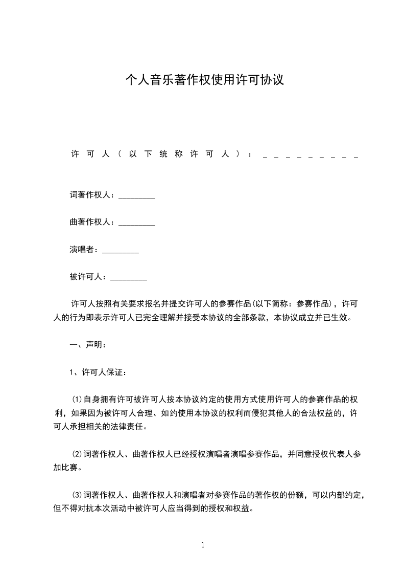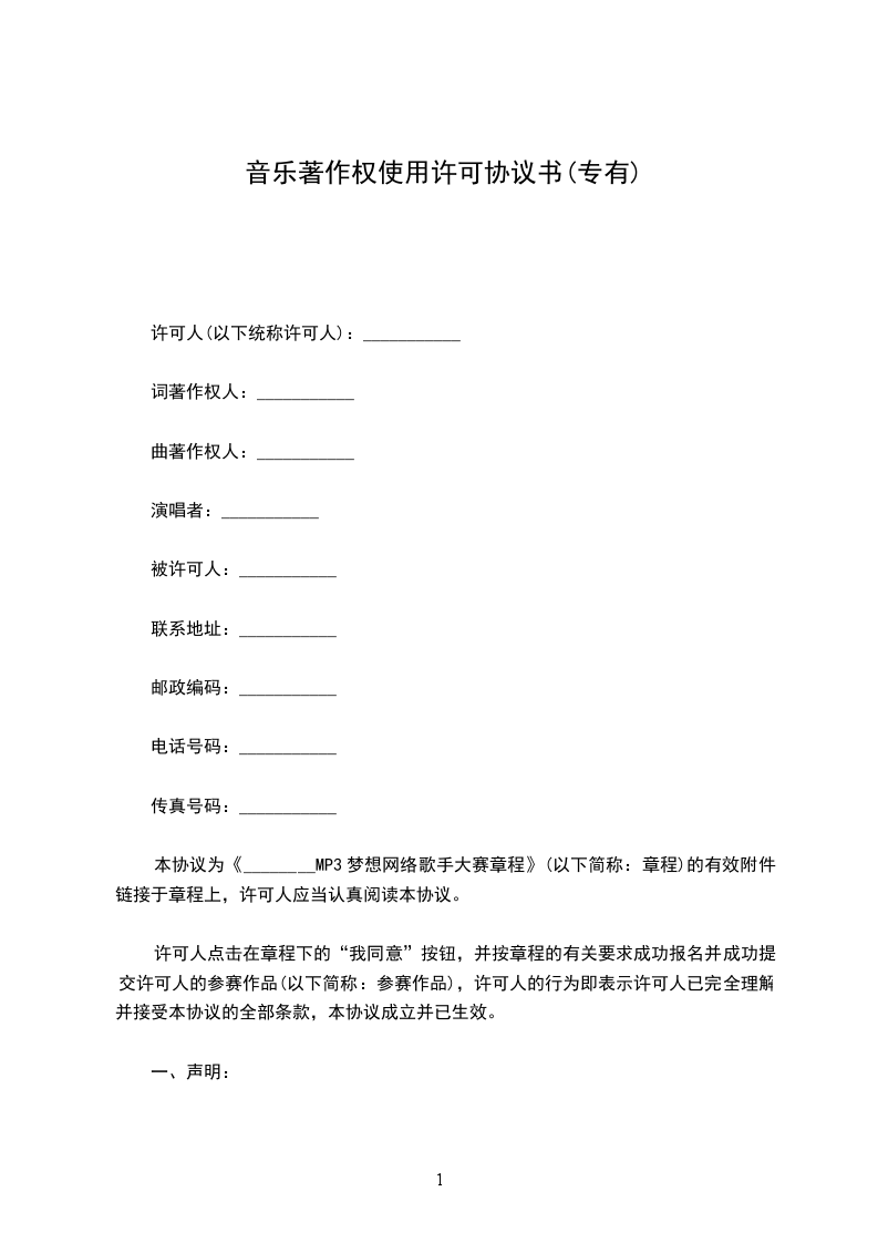 音乐著作权使用许可协议