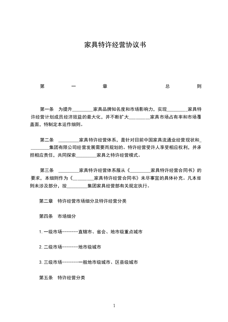 1.一般特许经营------特许人(_________集团)将“_________家具”经营权直接或间接授予受许人,受许人在指定的区域内享有_________家具特许经营权。
