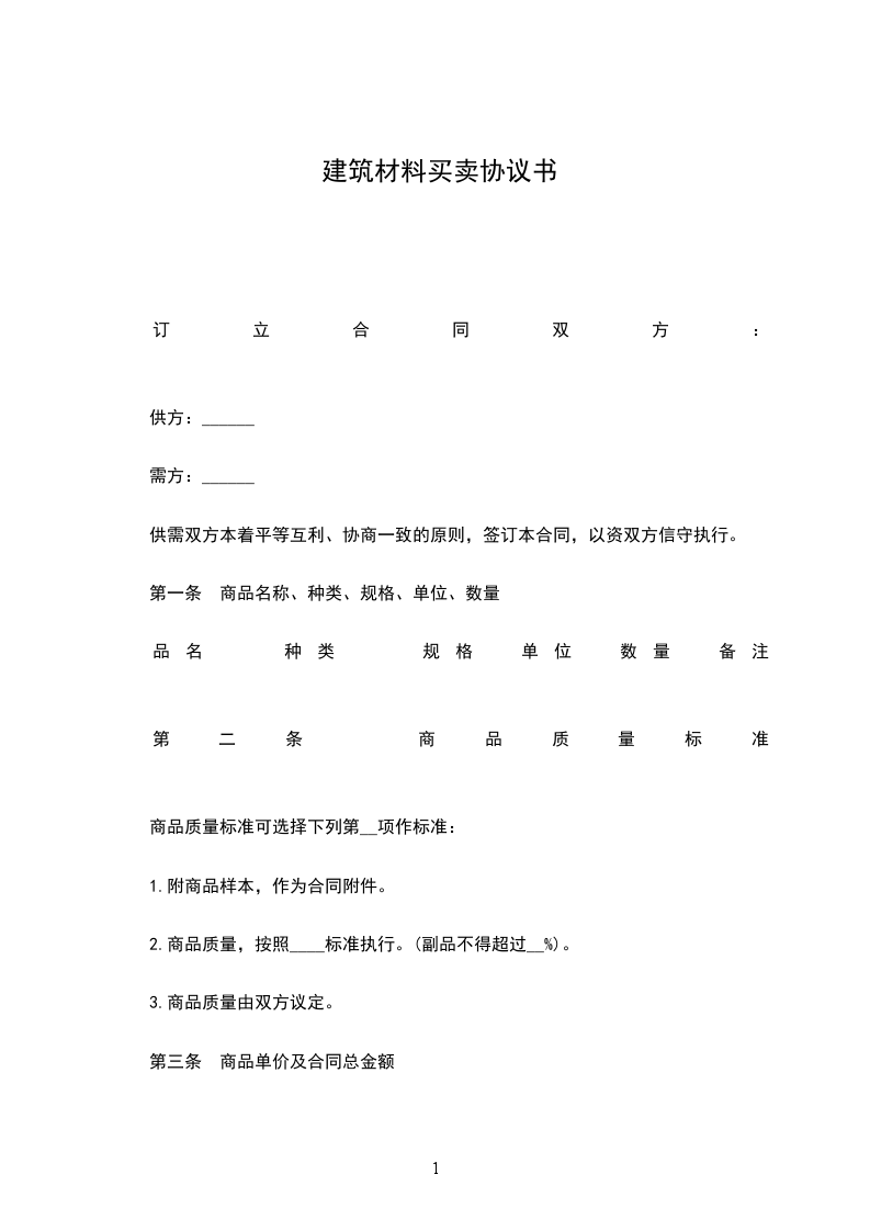 第一条 商品名称、种类、规格、单位、数量