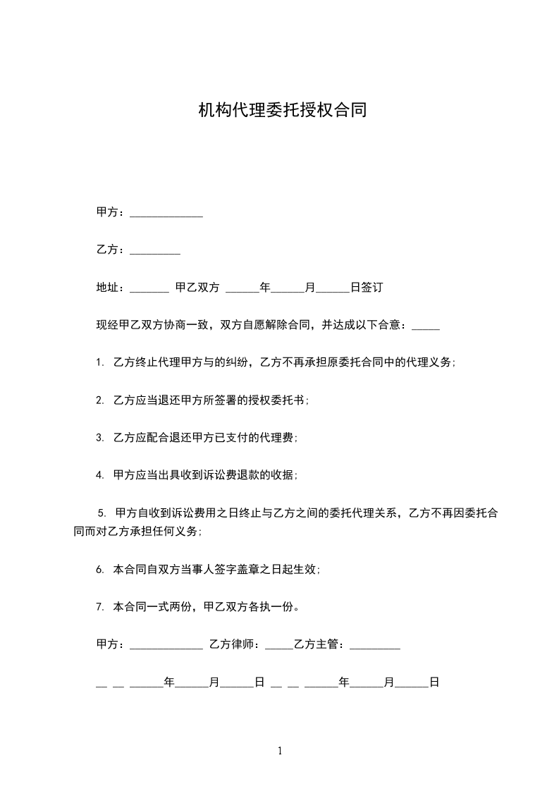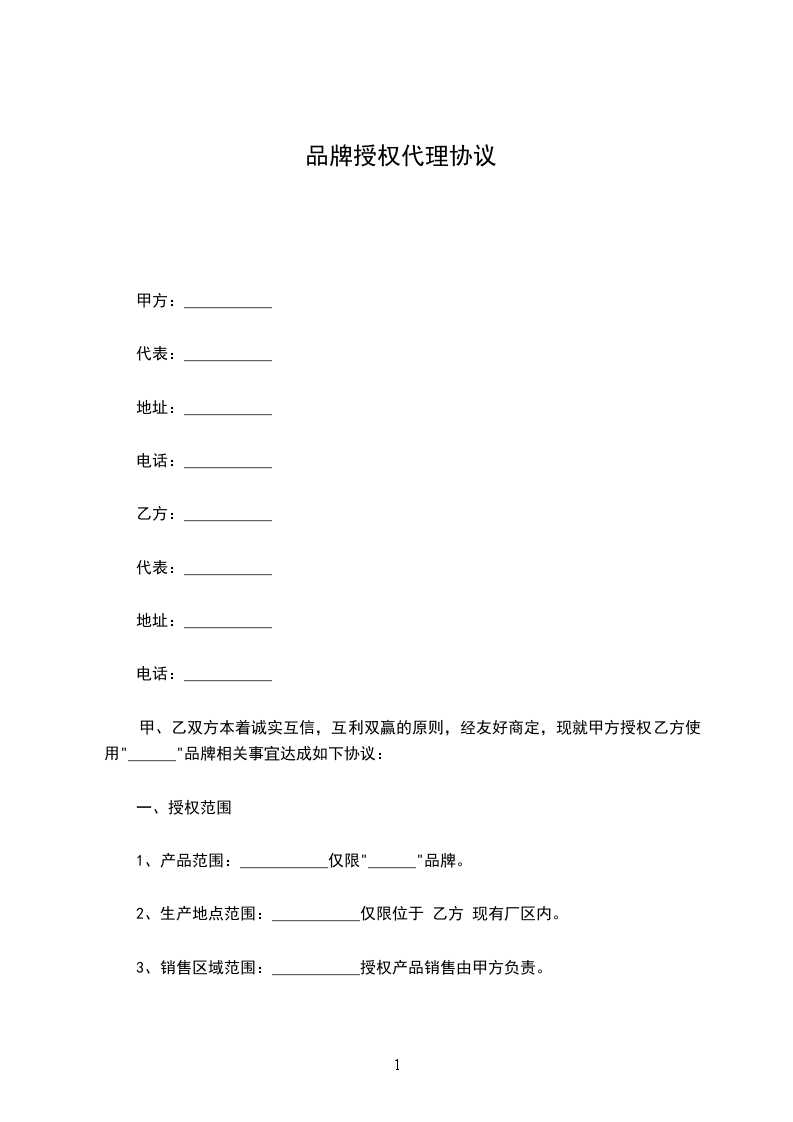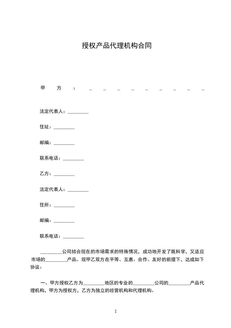 一、甲方授权乙方为_________地区的专业的_________公司的_________产品代理机构,甲方为授权方,乙方为独立的经营机构和代理机构。