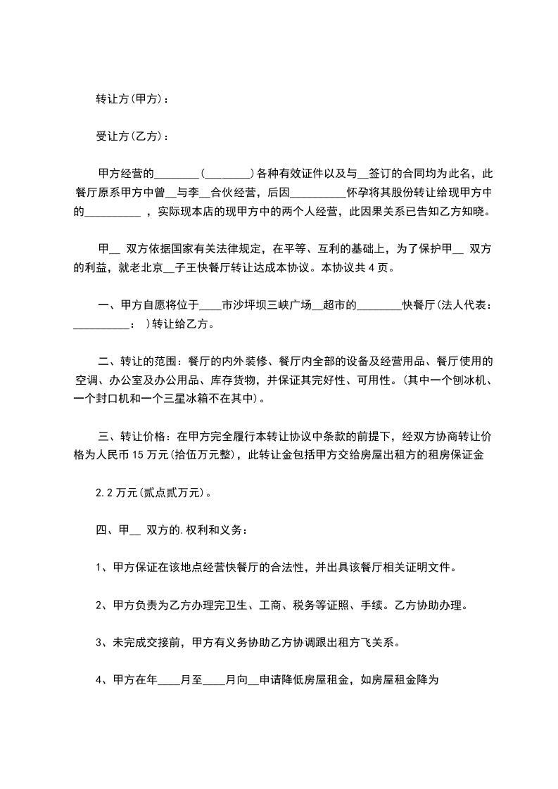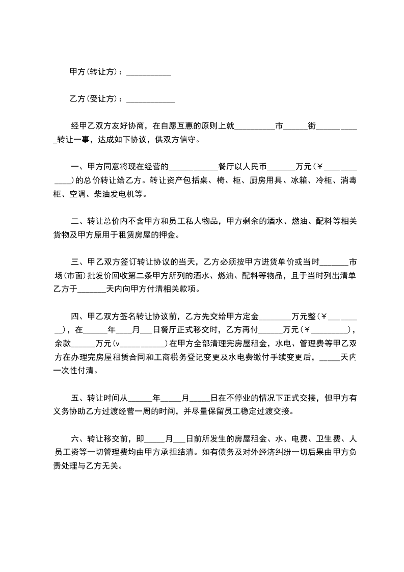 一、甲方同意将现在经营的____________餐厅以人民币_______万元(¥____________)的总价转让给乙方。转让资产包括桌、椅、柜、厨房用具、冰箱、冷柜、消毒柜、空调、柴油发电机等。