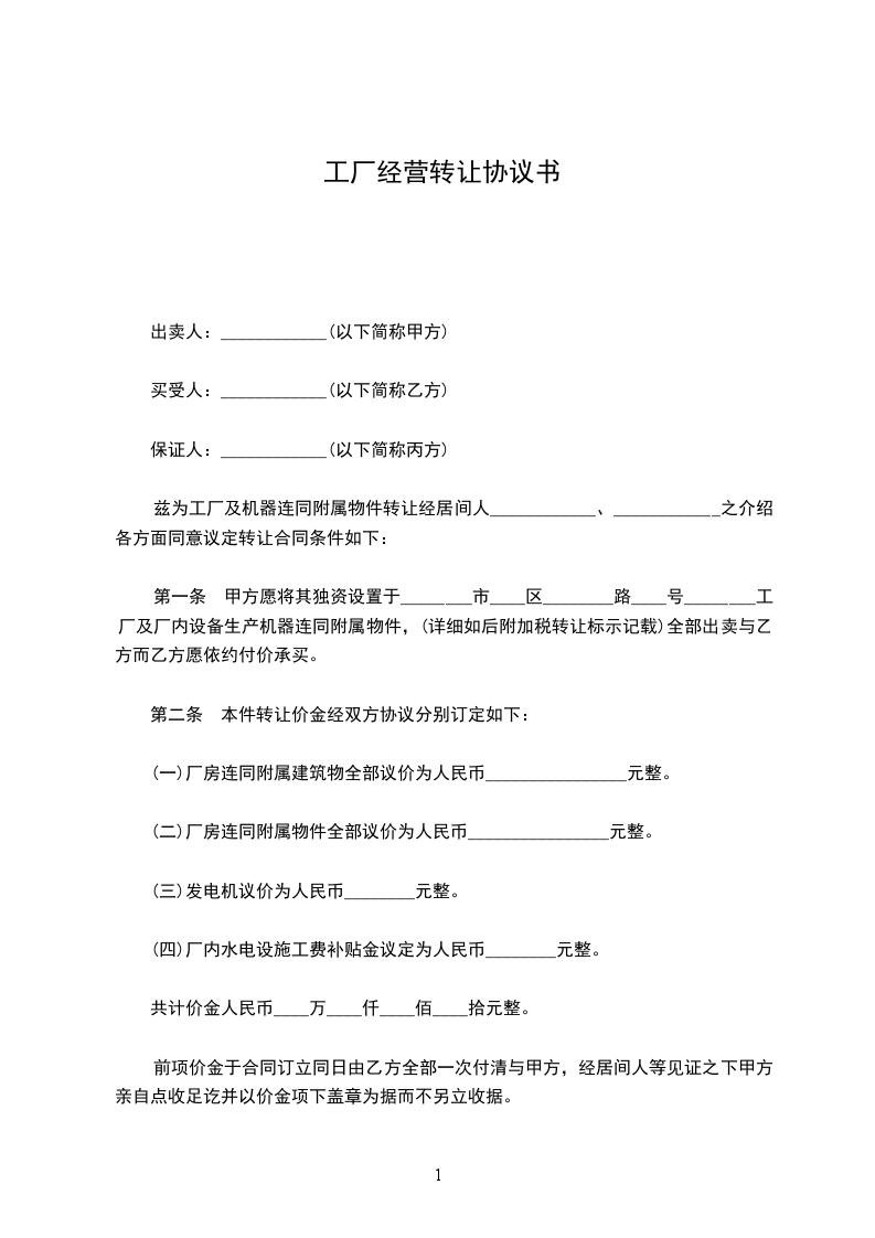 第一条 甲方愿将其独资设置于________市____区________路____号________工厂及厂内设备生产机器连同附属物件,(详细如后附加税转让标示记载)全部出卖与乙方而乙方愿依约付价承买。