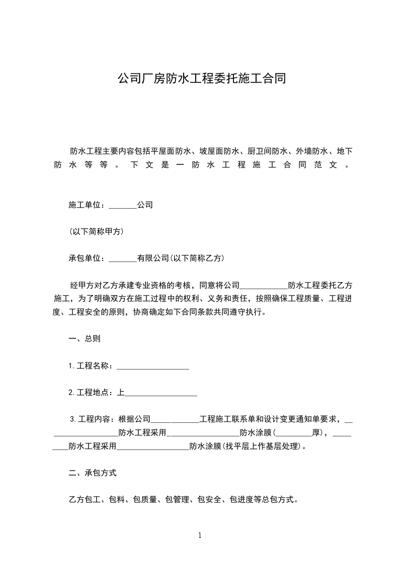 防水工程主要内容包括平屋面防水、坡屋面防水、厨卫间防水、外墙防水、地下防水等等。下文是一防水工程施工合同范文。