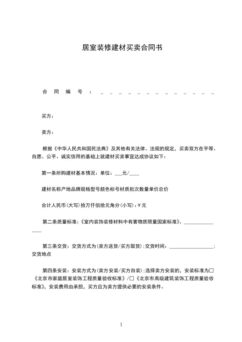 第四条安装:安装方式为(卖方安装/买方自装);选择卖方安装的,安装标准为□《北京市家庭居室装饰工程质量验收标准》/□《北京市高级建筑装饰工程质量验收标准》,安装费用由承担,买方应为卖方提供必要的安装条件。