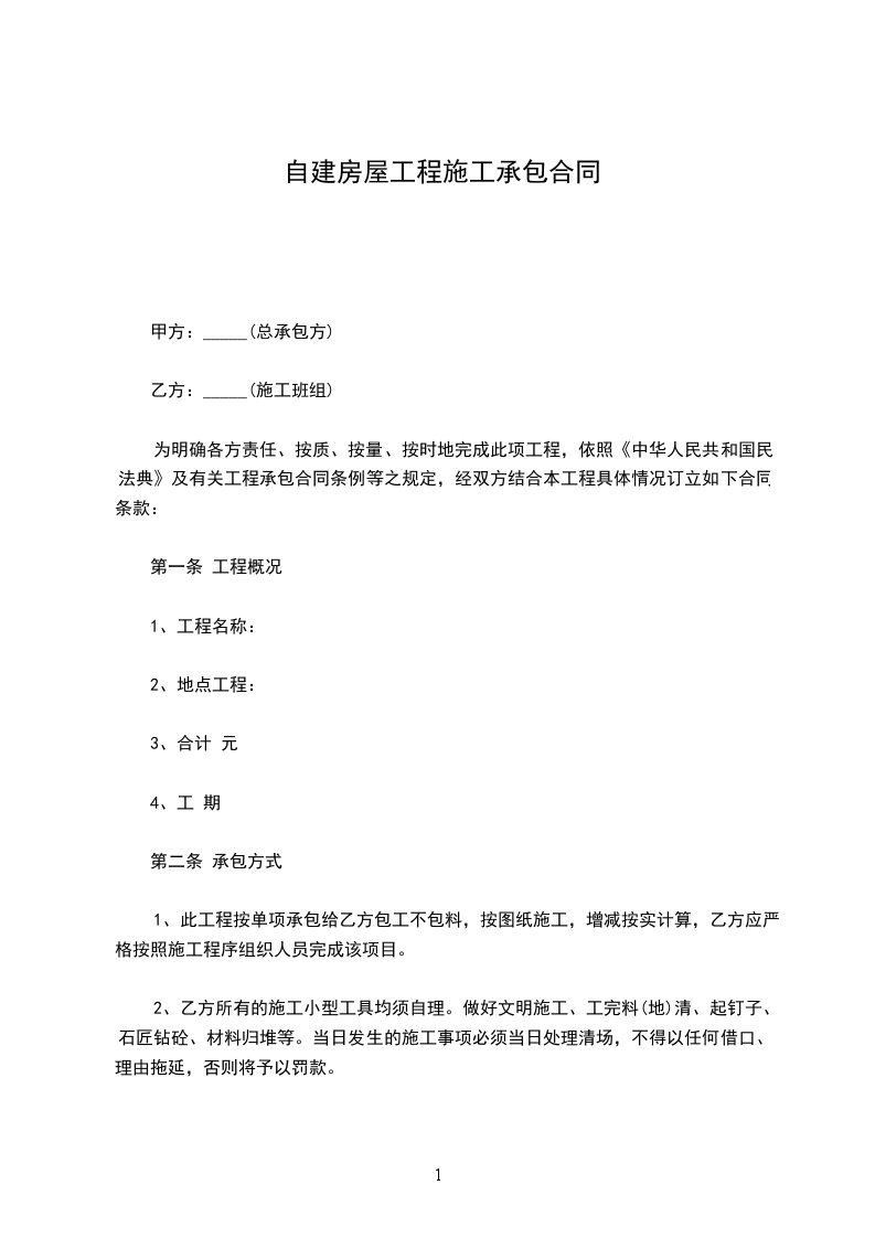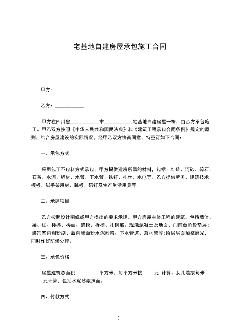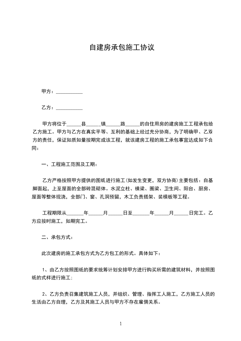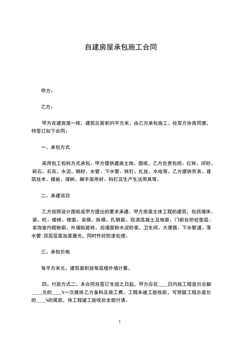 采用包工包料方式承包。甲方提供建房土地、图纸,乙方负责包括:红砖、河砂、碎石、石灰、水泥、钢材、水管、下水管、铁钉、扎丝、水电等。乙方提供劳务、建筑技术、模板、撑树、脚手架用材、码钉及生产生活用具等。