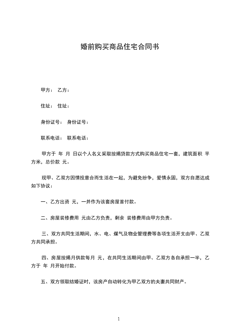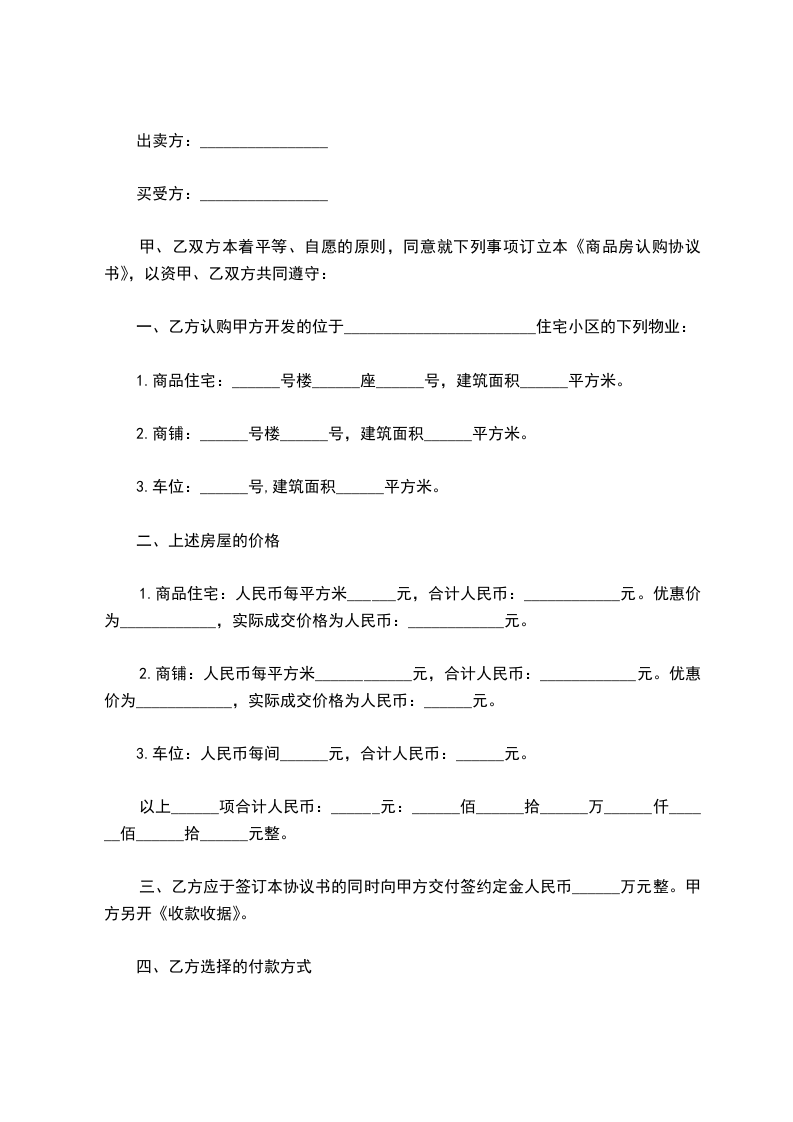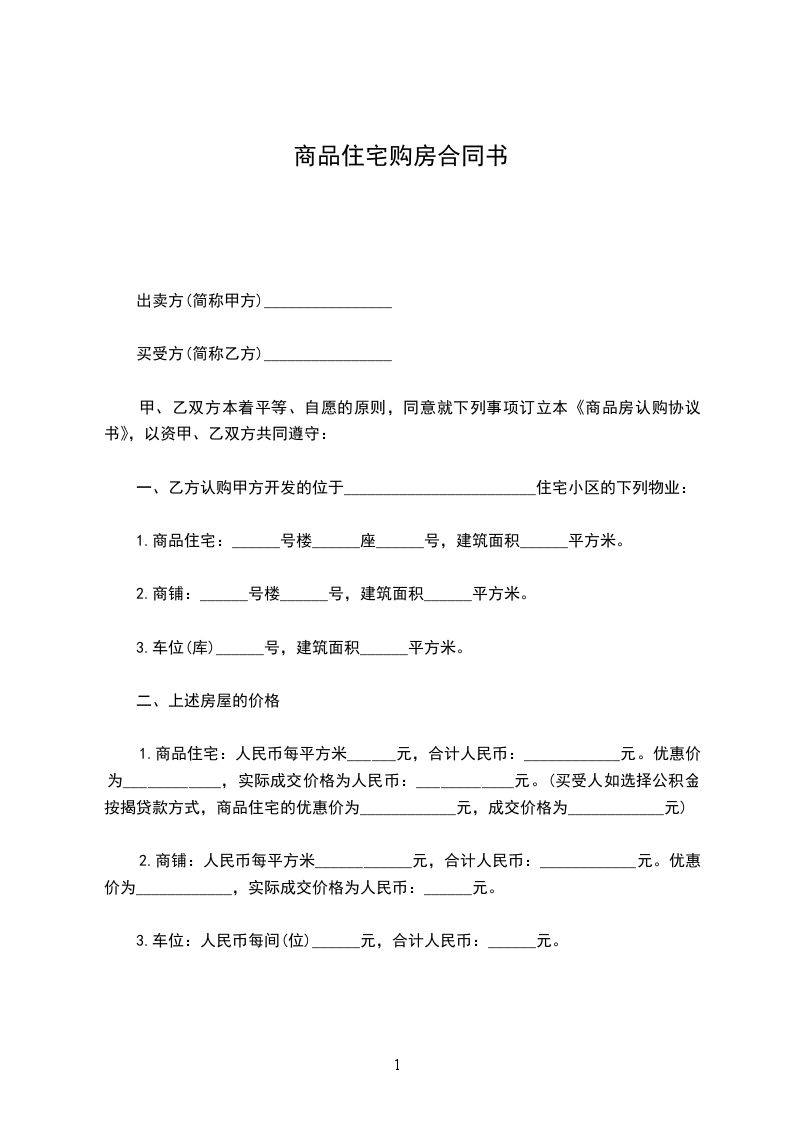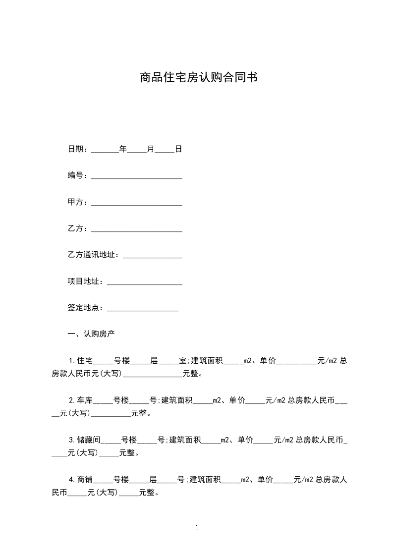 1.住宅_____号楼_____层_____室;建筑面积_____m2、单价__________元/m2总房款人民币_____元(大写)_______________元整。