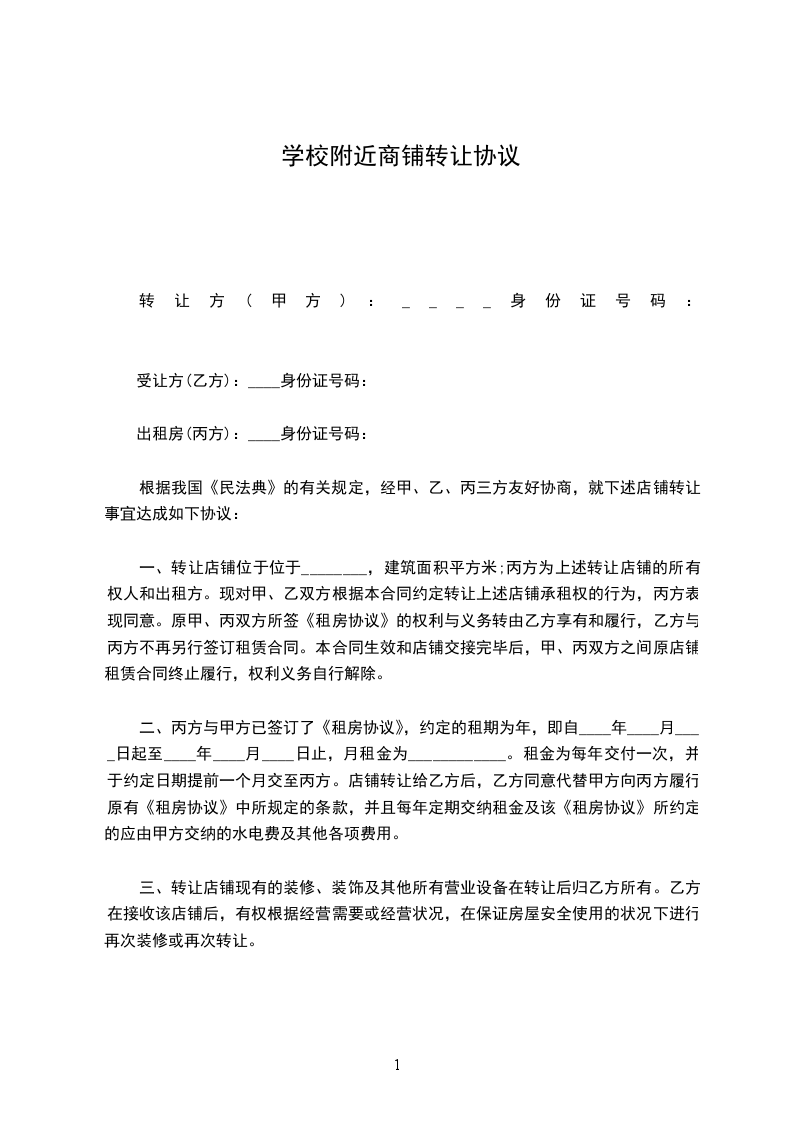 根据我国《民法典》的有关规定,经甲、乙、丙三方友好协商,就下述店铺转让事宜达成如下协议: