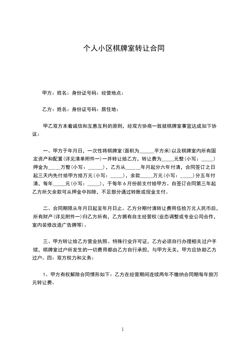 一、甲方于______年____月____日,一次性将棋牌室(面积为______平方米)以及棋牌室内所有固定资产和配置(详见清单附件一)一并转让给乙方,转让费为_____元整(小写:_____),押金为_____万整(小写:______),乙方从______年月起分六年付清,合同签订之日起三天内先付给甲方拾万元(小写:_____),余款_____万元(小写:_____)分五年付清,每年_____元(小写:_____),于每年6月份前支付给甲方。自签订合同第三年起,乙方所欠余款可从押金中扣除,不足部分通过转账或现金支付。