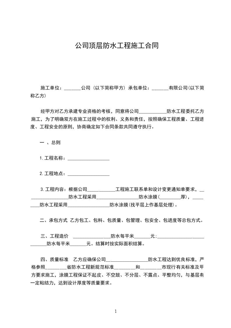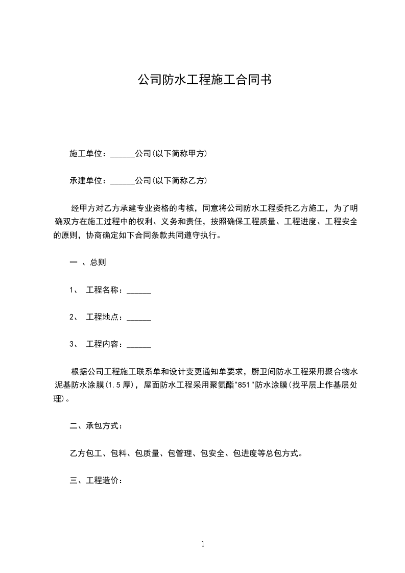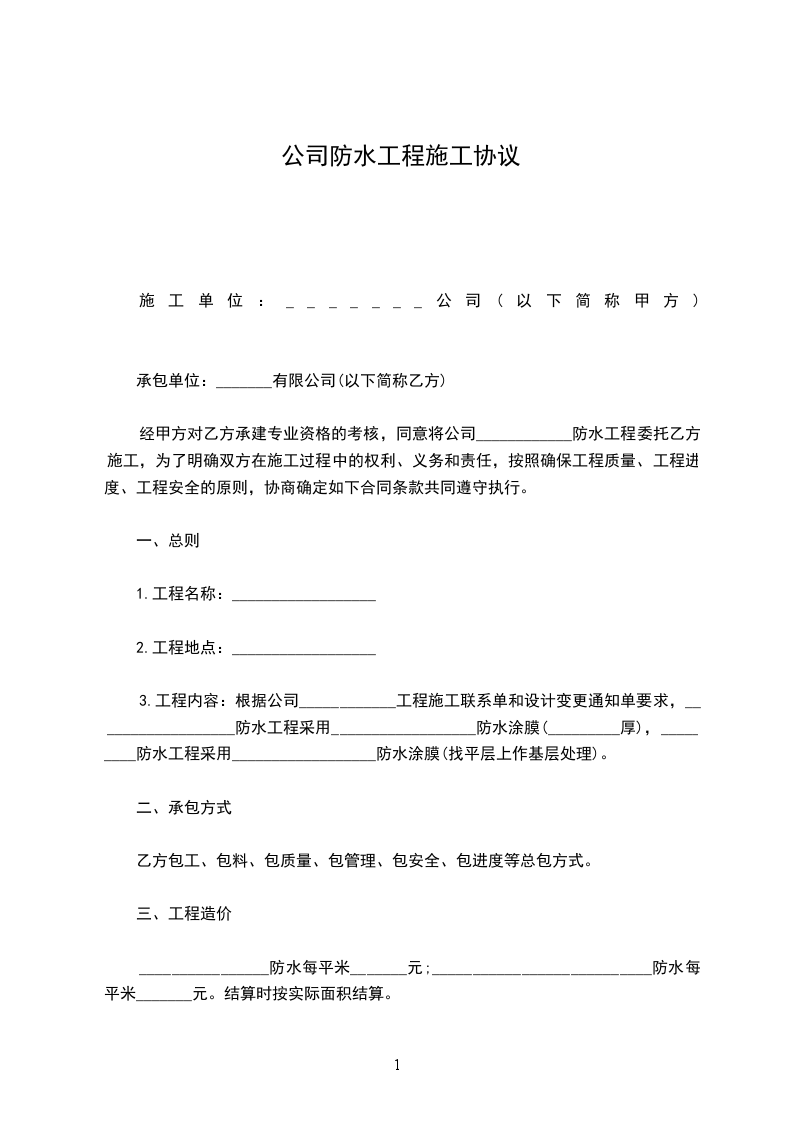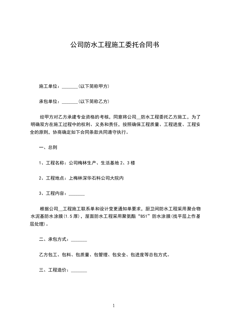 经甲方对乙方承建专业资格的考核,同意将公司____________防水工程委托乙方施工,为了明确双方在施工过程中的权利、义务和责任,按照确保工程质量、工程进度、工程安全的原则,协商确定如下合同条款共同遵守执行。