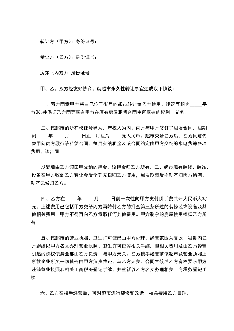 八、甲方与丙方所签的房屋租赁合同到期后乙方有权要求甲方注销营业执照和相关工商税务登记手续,并重新以乙方名义办理相关工商税务登记手续。甲方必须协助乙方办理所有证件的过户变更手续,费用乙方自付,如因为证件不能过户,导致乙方不能接手经营,则甲方需退还乙方支付的所有转让费及违约金。(违约金为总额的____%)