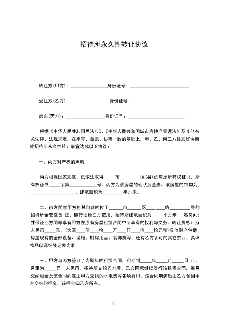 根据《中华人民共和国民法典》、《中华人民共和国城市房地产管理法》及其他有关法律、法规规定,在平等、自愿、协商一致的基础上,甲、乙、丙三方经友好协商,就招待所永久性转让事宜达成以下协议: