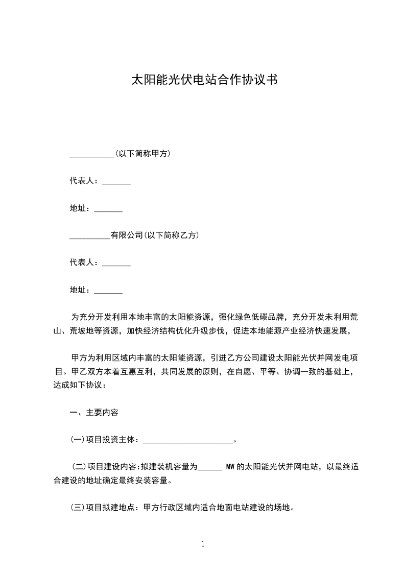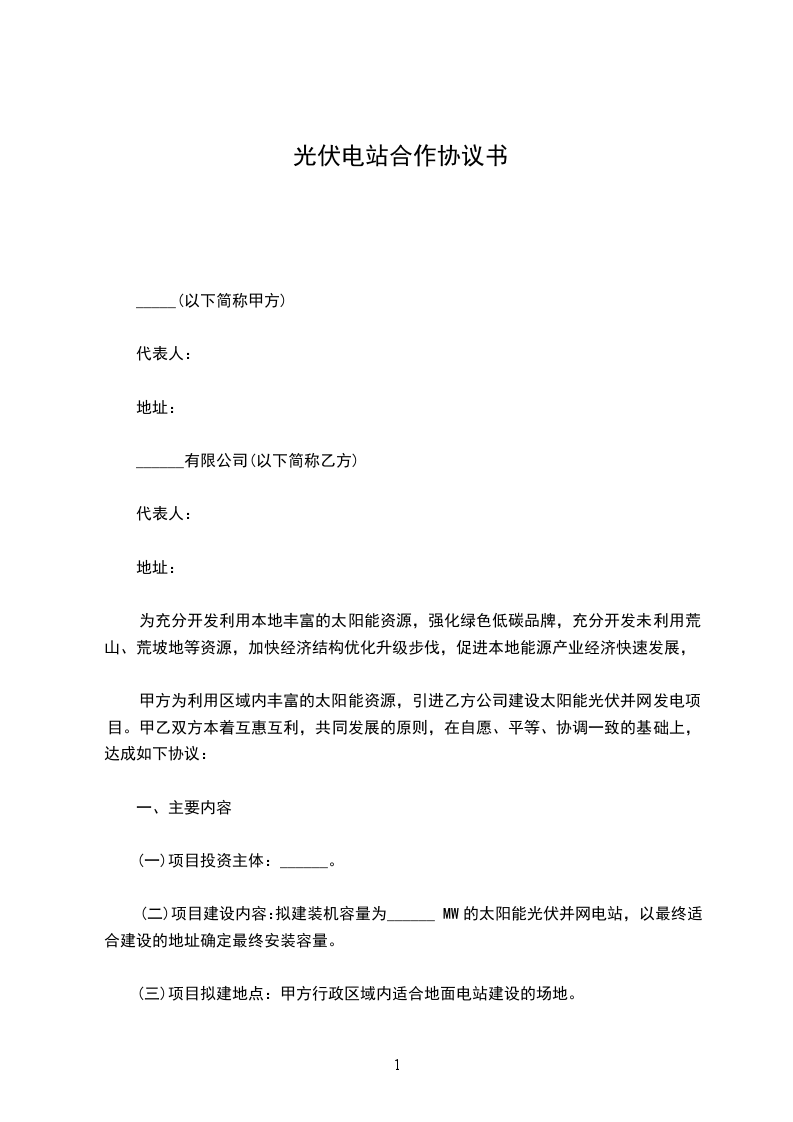 甲方为利用区域内丰富的太阳能资源,引进乙方公司建设太阳能光伏并网发电项目。甲乙双方本着互惠互利,共同发展的原则,在自愿、平等、协调一致的基础上,达成如下协议: