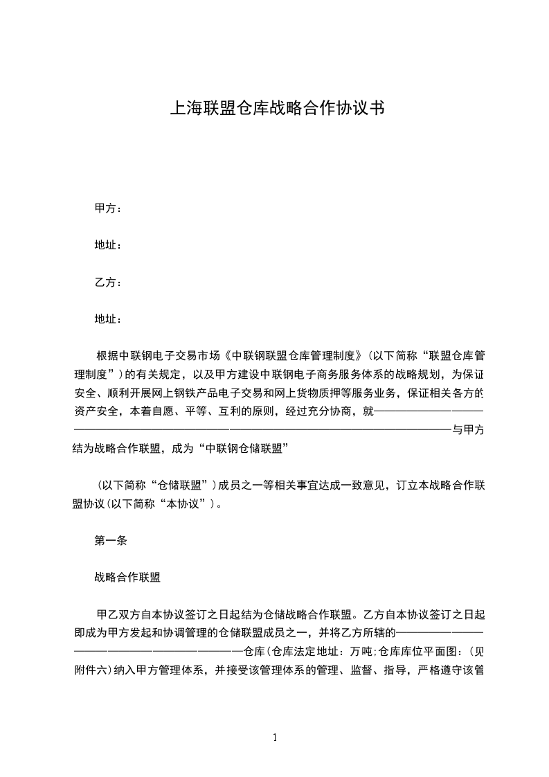 -乙方提供其在[具体地区]的物流仓储设施,仓储面积为[X]平方米,用于存放联盟货物。甲方有权在该仓储设施内按照规定存放货物。