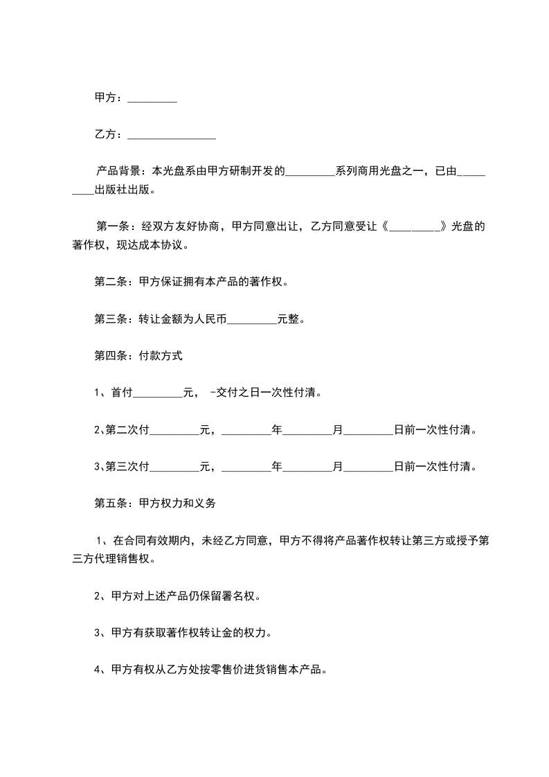 第一条:经双方友好协商,甲方同意出让,乙方同意受让《》光盘的着作权,现达成本协议。