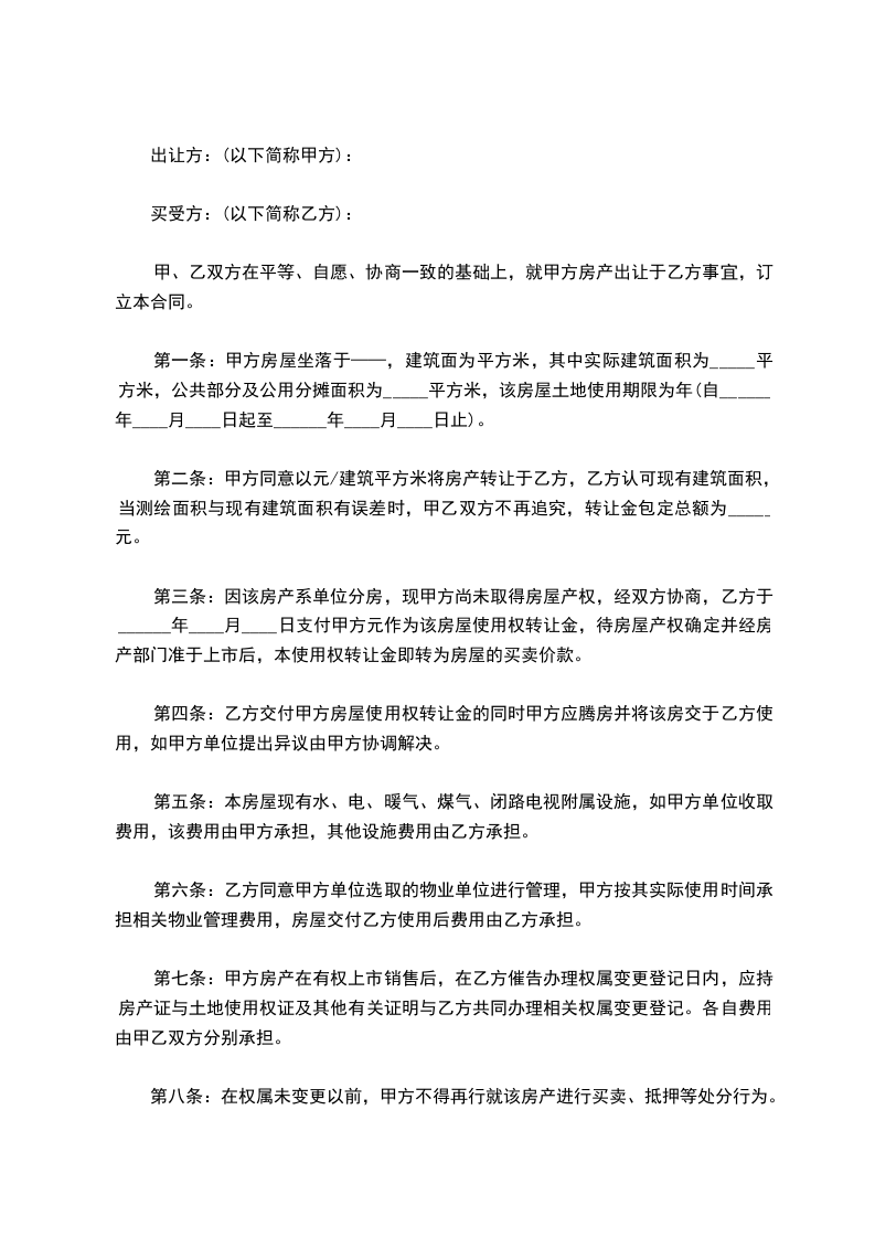 第三条:因该房产系单位分房,现甲方尚未取得房屋产权,经双方协商,乙方于______年____月____日支付甲方元作为该房屋使用权转让金,待房屋产权确定并经房产部门准于上市后,本使用权转让金即转为房屋的买卖价款。