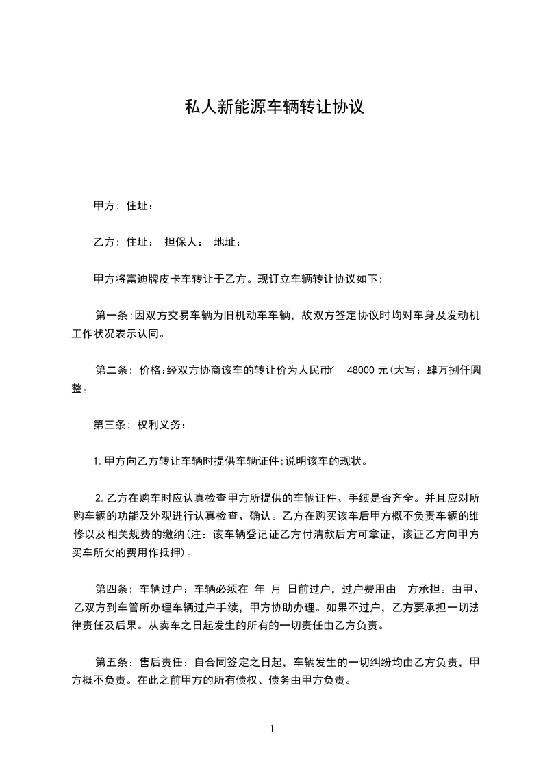 第二条: 价格:经双方协商该车的转让价为人民币¥48000元(大写:肆万捌仟圆整。