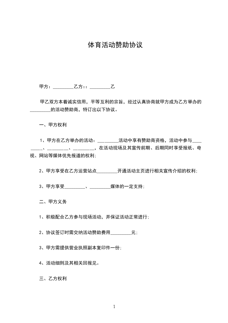 鉴于乙方将举办/参与[体育项目名称],甲方愿意为该体育项目提供赞助,双方经友好协商,依据《中华人民共和国民法典》及相关法律法规的规定,达成如下协议: