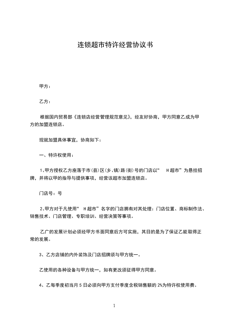 1、甲方授权乙方座落于市(县)区(乡、镇)路(街)号的门店以“H超市”为悬挂招牌,并将以甲的指导与提供事项,经营该超市加盟连锁店。