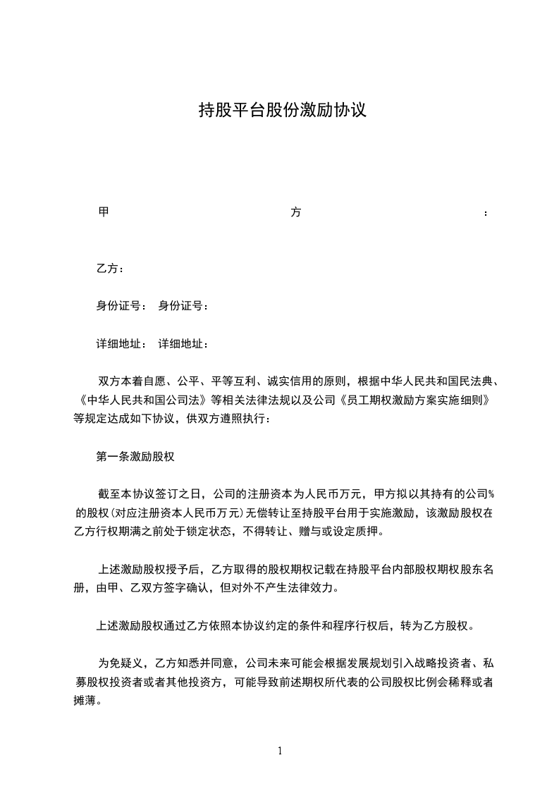 截至本协议签订之日,公司的注册资本为人民币_____万元,甲方拟以其持有的公司%的股权(对应注册资本人民币_____万元)无偿转让至持股平台用于实施激励,该激励股权在乙方行权期满之前处于锁定状态,不得转让、赠与或设定质押。