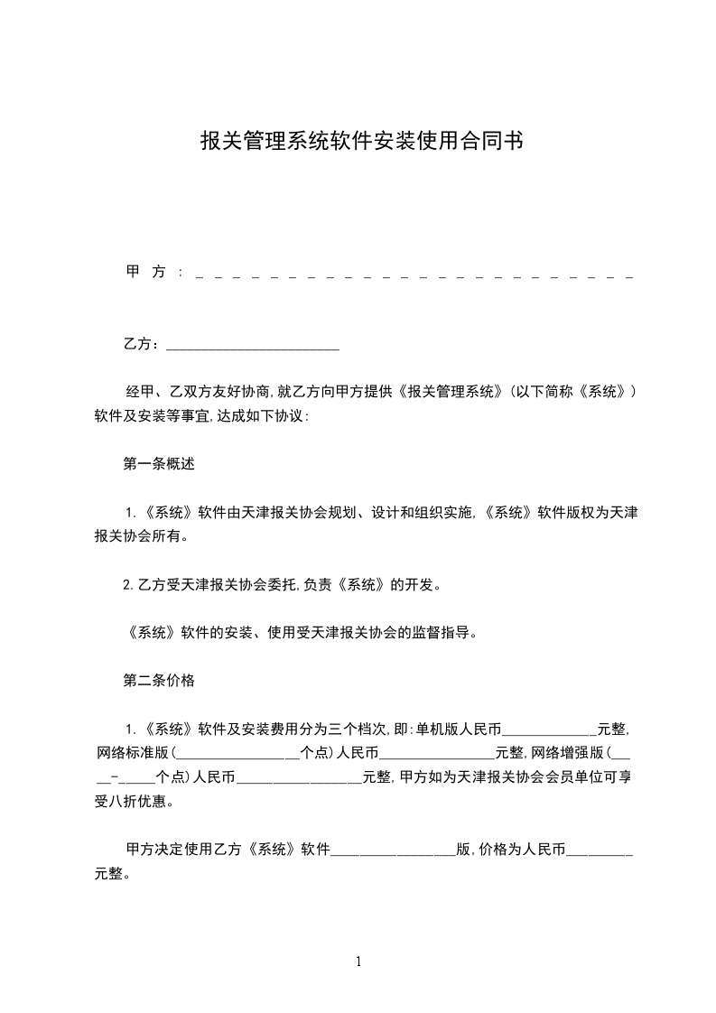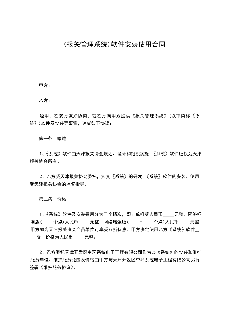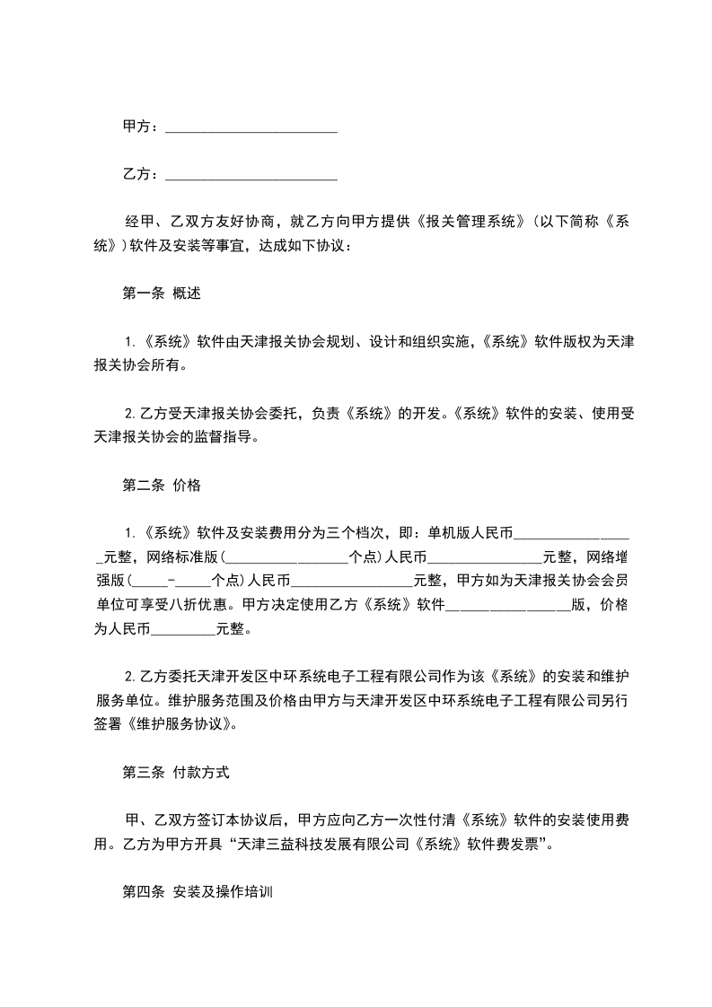 1.《系统》软件及安装费用分为三个档次,即:单机版人民币_____________元整,网络标准版(_________________个点)人民币________________元整,网络增强版(_____-_____个点)人民币_________________元整,甲方如为天津报关协会会员单位可享受八折优惠。