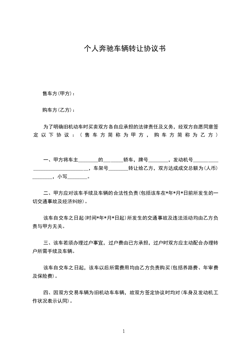 一、甲方将车主________的________轿车,牌号________,发动机号________________________________,车架号________转让给乙方,双方达成成交总额为(人币)________,小写________。
