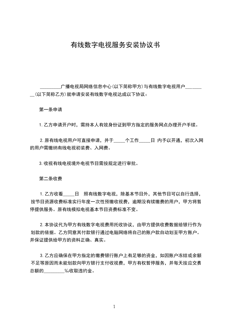 _________(以下简称“甲方”)与有线数字电视用户(以下简称“乙方”)就申请安装有线数字电视达成以下协议: