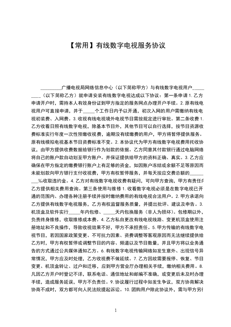 9、甲方承诺向乙方提供有线数字电视服务,乙方有权监督服务质量,并提出批评、建议及申告。