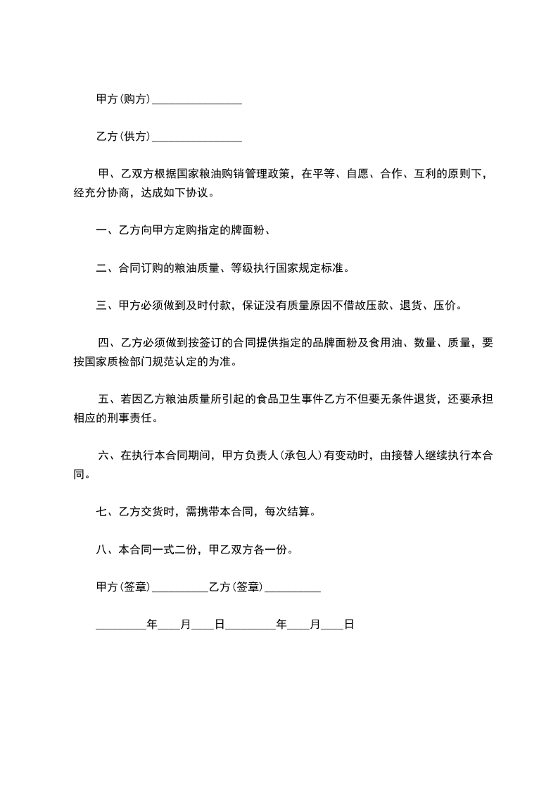 四、乙方必须做到按签订的合同提供指定的品牌面粉及食用油、数量、质量,要按国家质检部门规范认定的为准。