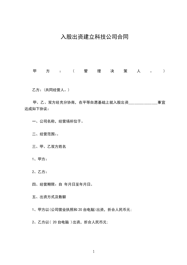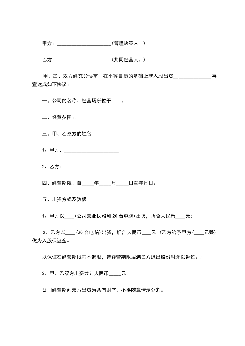 2、乙方以____(20台电脑)出资,折合人民币____元;(乙方给予甲方(____元整)做为入股保证金。