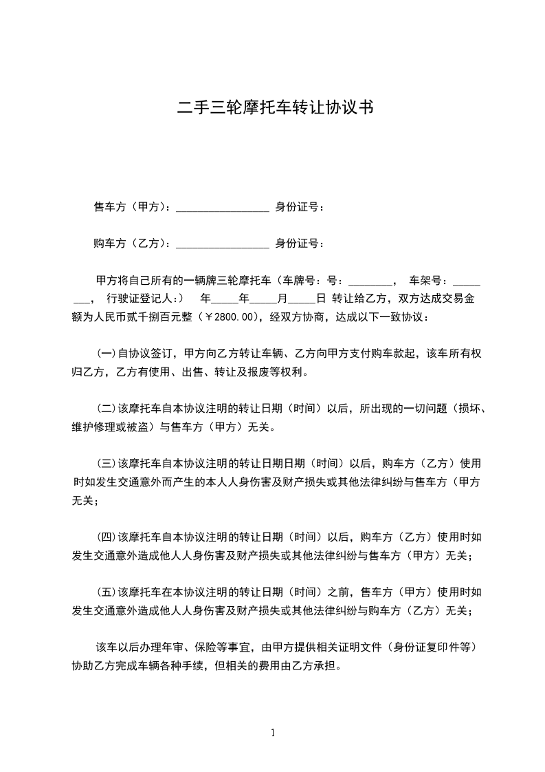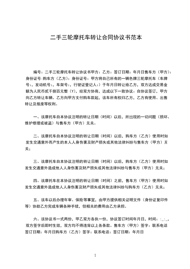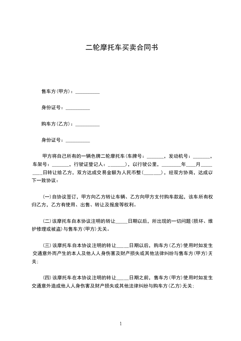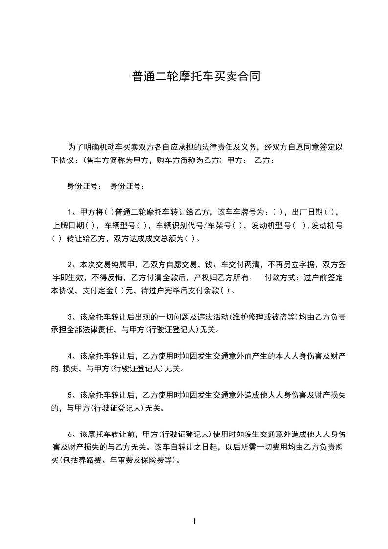 售车方(甲方):购车方(乙方):见证人(丙方):为了明确旧机动车转让时买卖双方各自应承担的法律责任,甲乙双方本着自愿平等的原则,经协商就普通二轮摩托车转让达成协议如下: