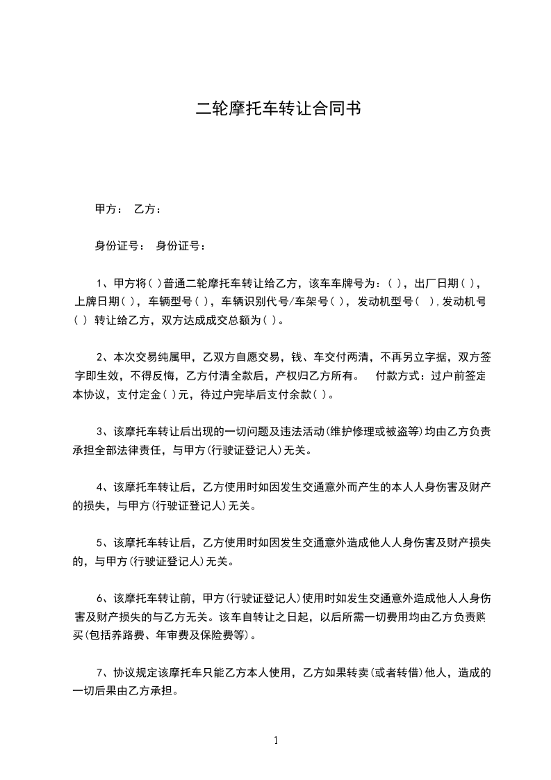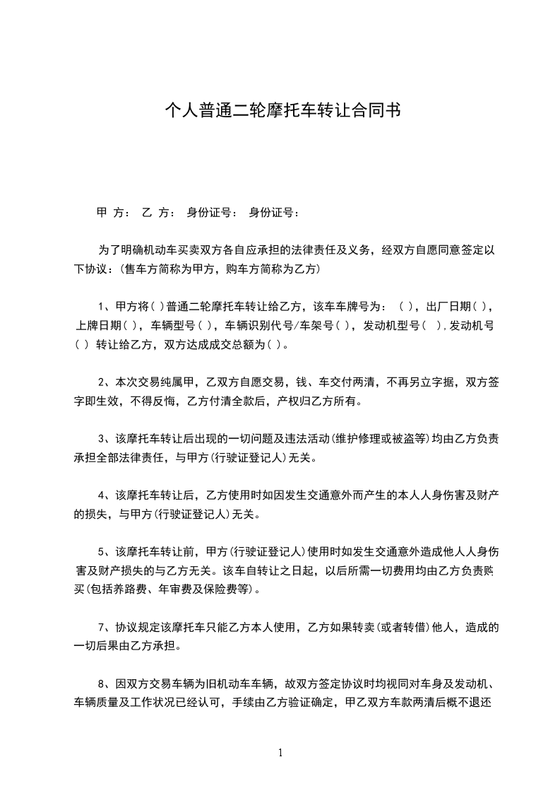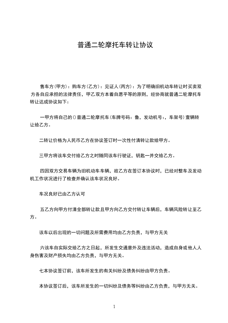 一甲方将自己的()普通二轮摩托车(车牌号码:鲁,发动机号:,车架号)壹辆转让给乙方。